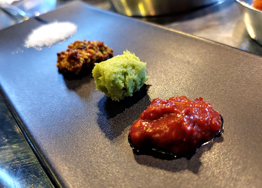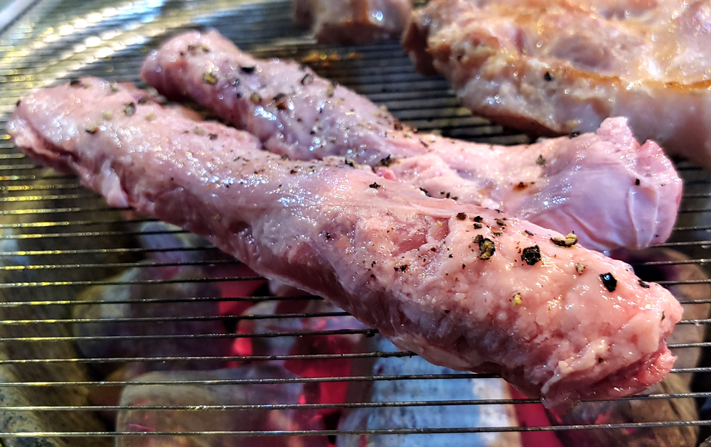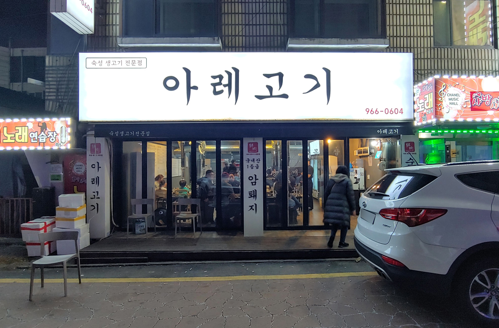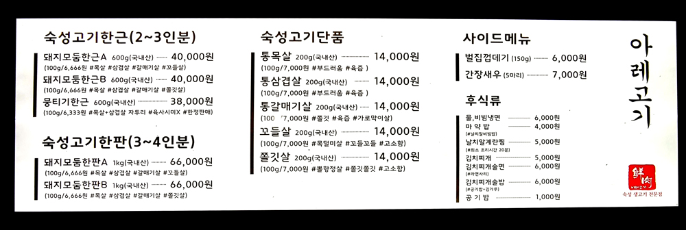 원당역 부근의 숙성 돼지고기 맛집 아레고기 고양본점의 숙성 돼지모둠한근A와 돼지껍데기입니다.