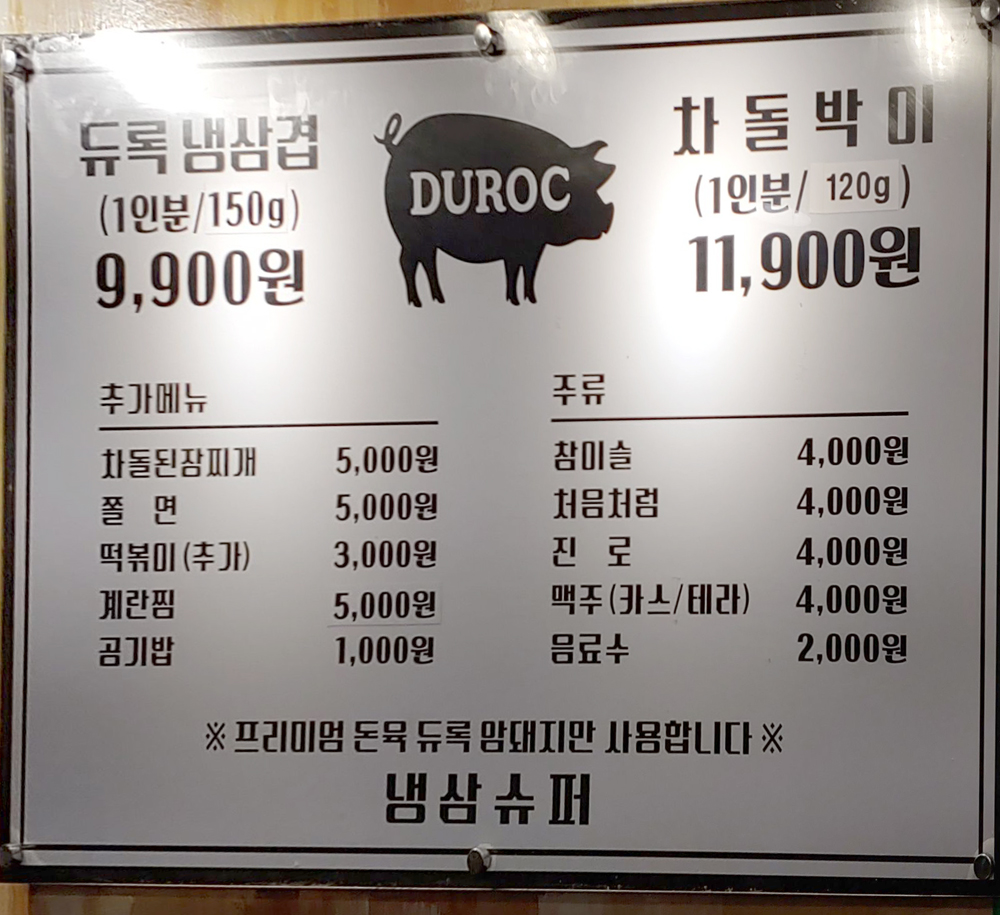 은평구 구산동에 있는 듀록 삼겹살 전문 냉삼슈퍼입니다.