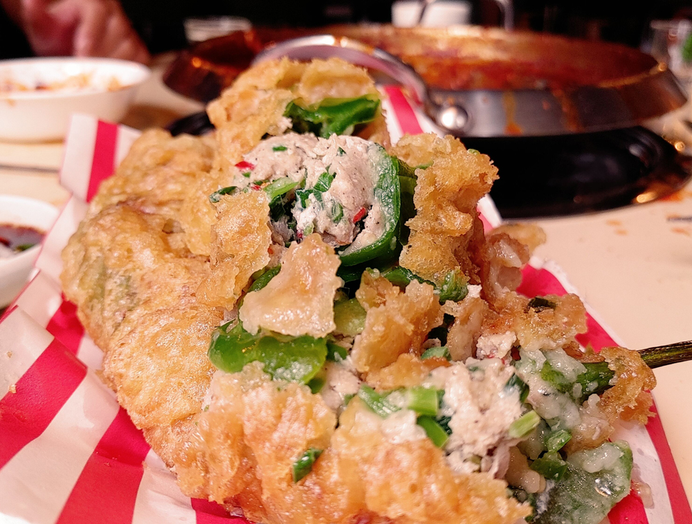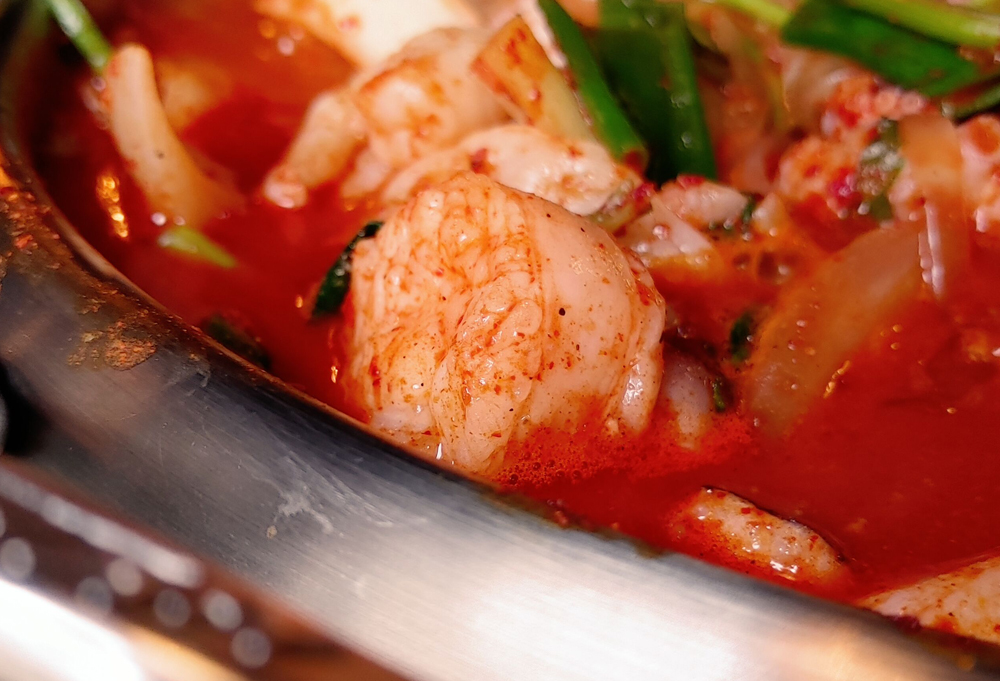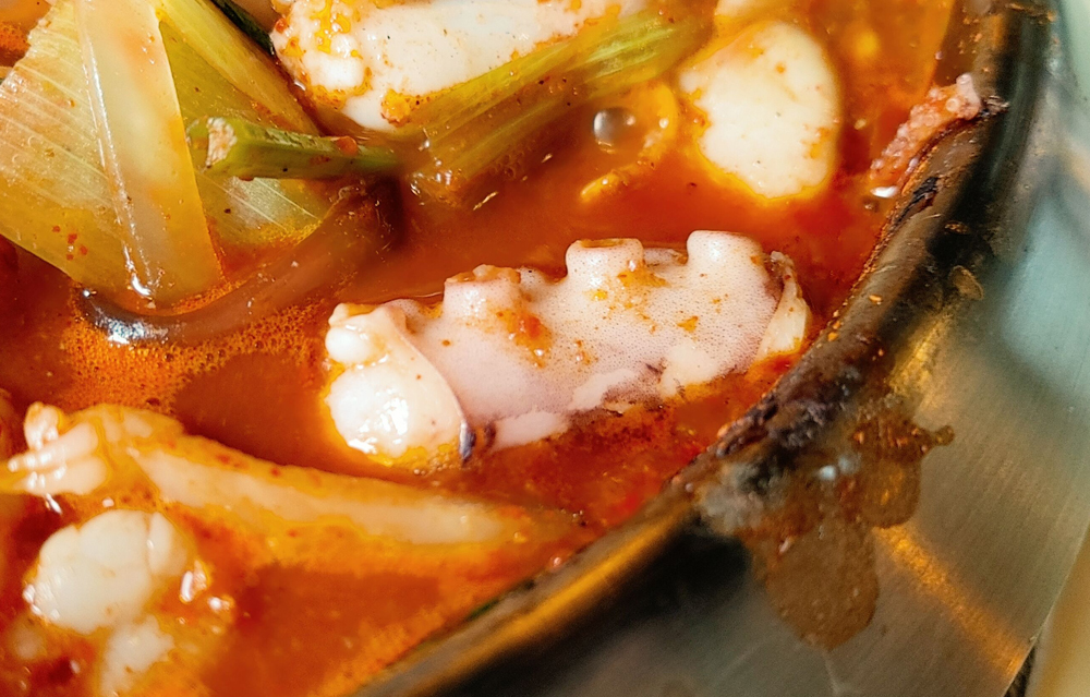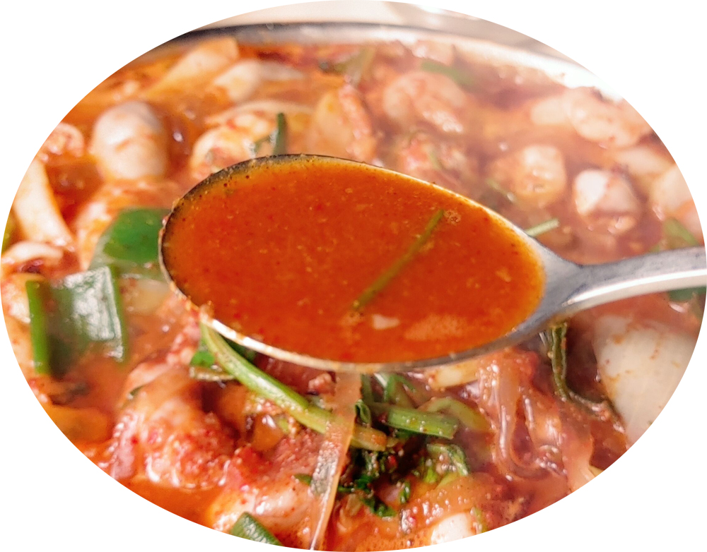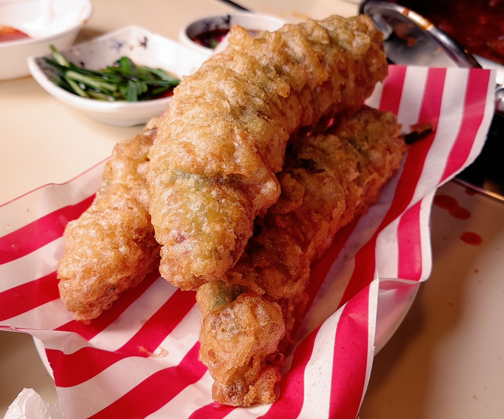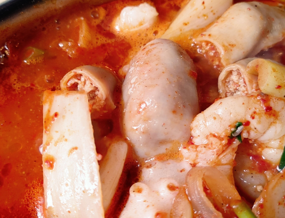 얼큰하고 달달한 떡볶이 국물의 낙곱새전골과 고추튀김 맛있습니다!
