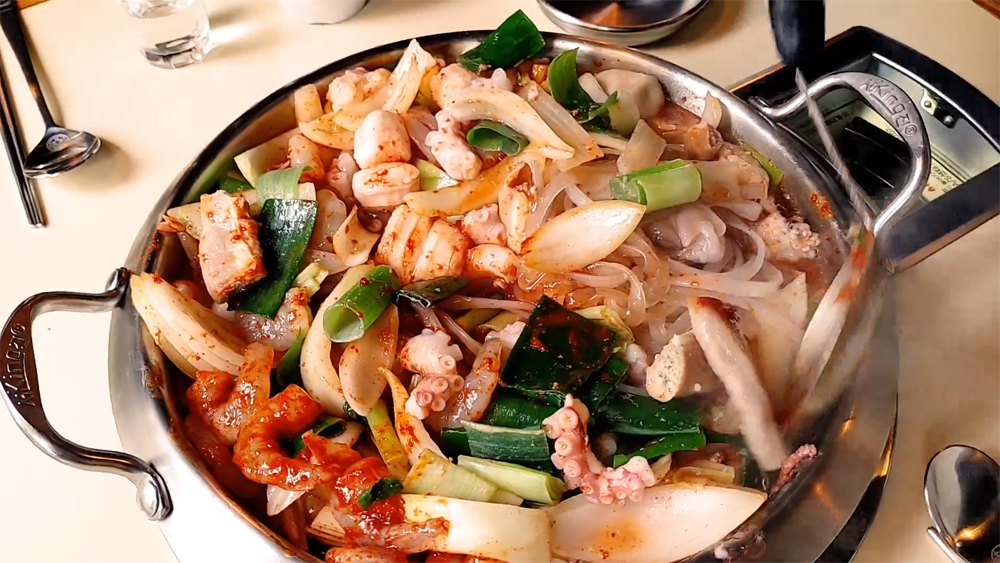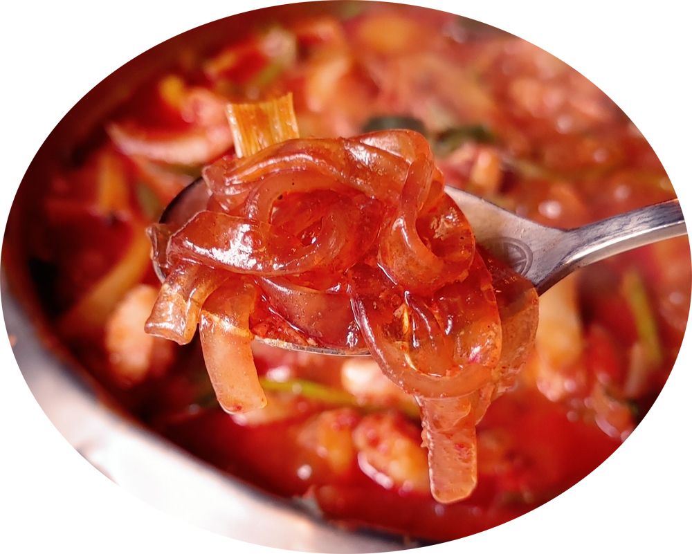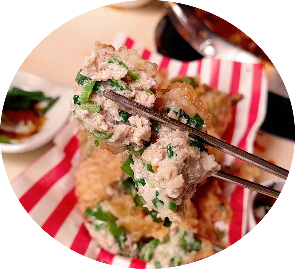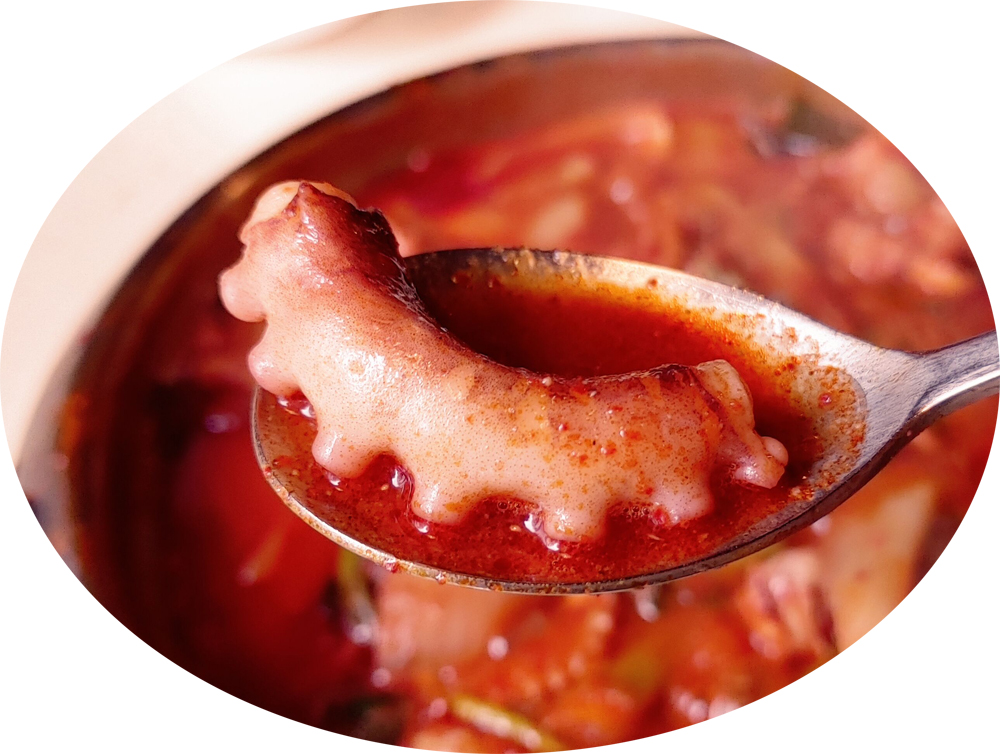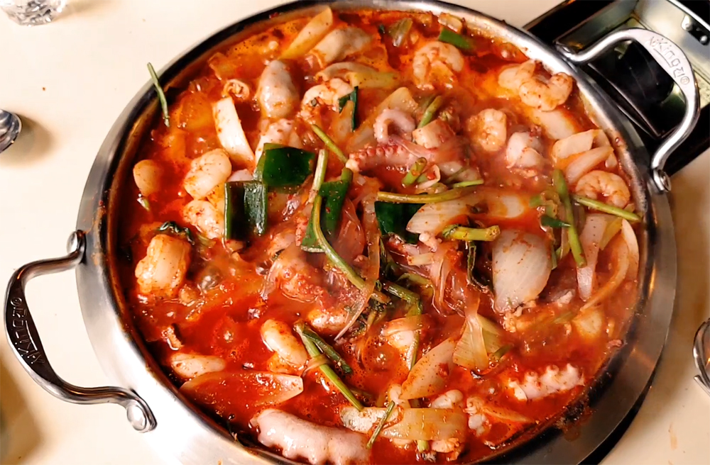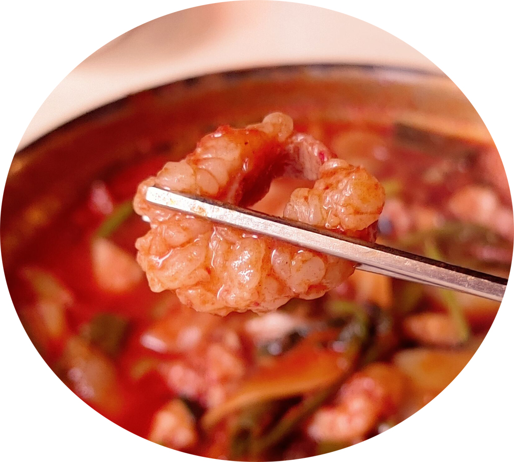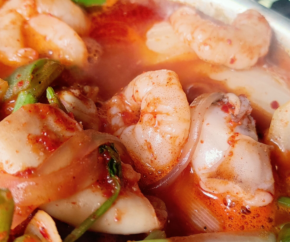 얼큰하고 달달한 떡볶이 국물의 낙곱새전골과 고추튀김 맛있습니다!