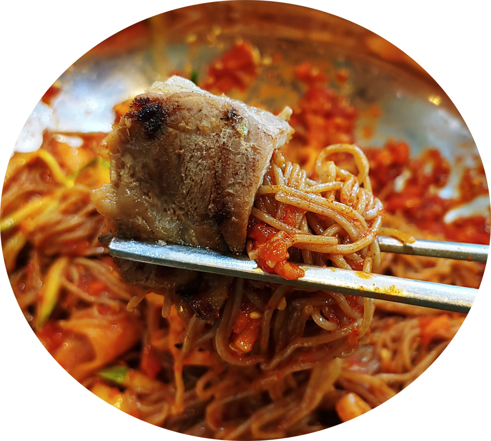 냉면에 돼지 숯불고기를 푸짐하게 먹을 수 있는 곳입니다.