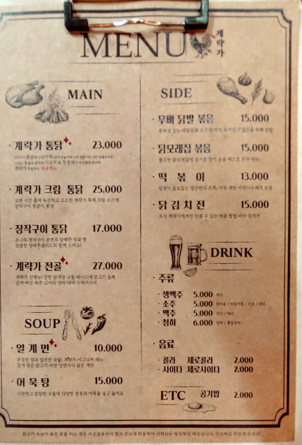 장작구이통닭 외에도 열계면, 닭김치전 등 다양한 닭 응용 안주가 있습니다.