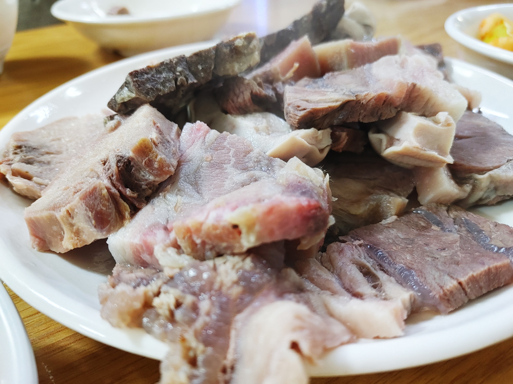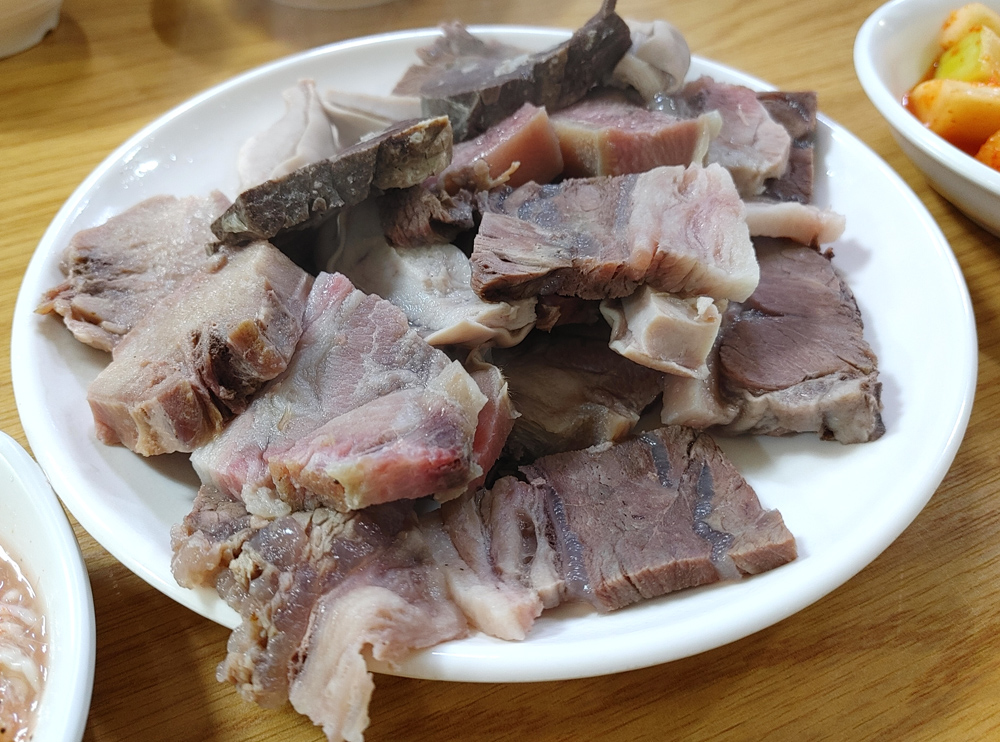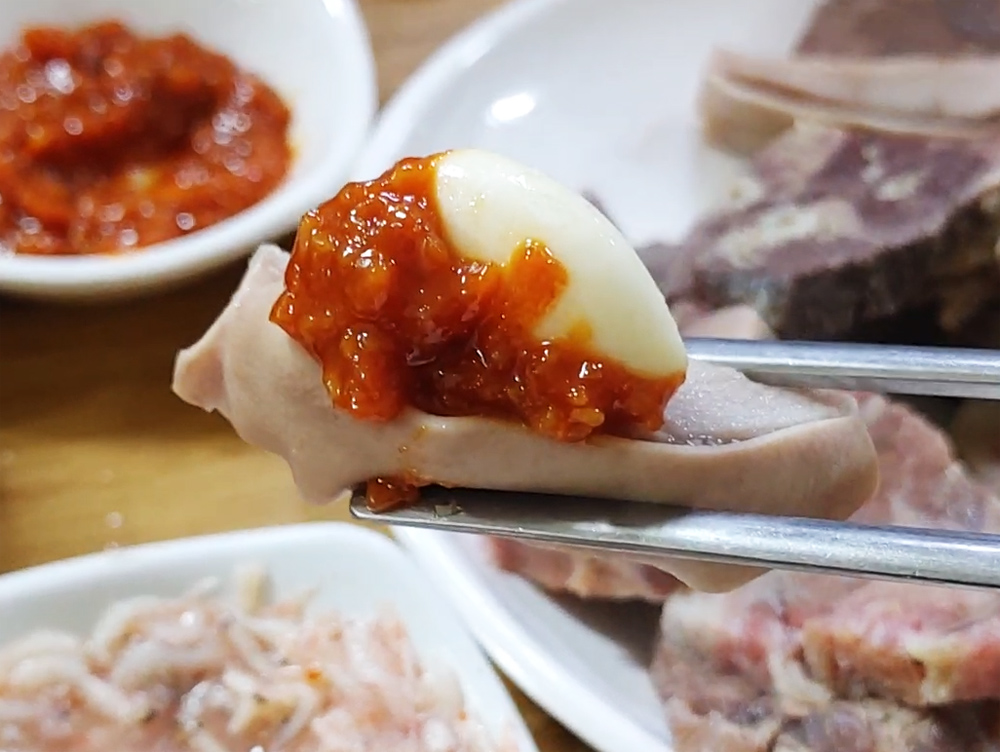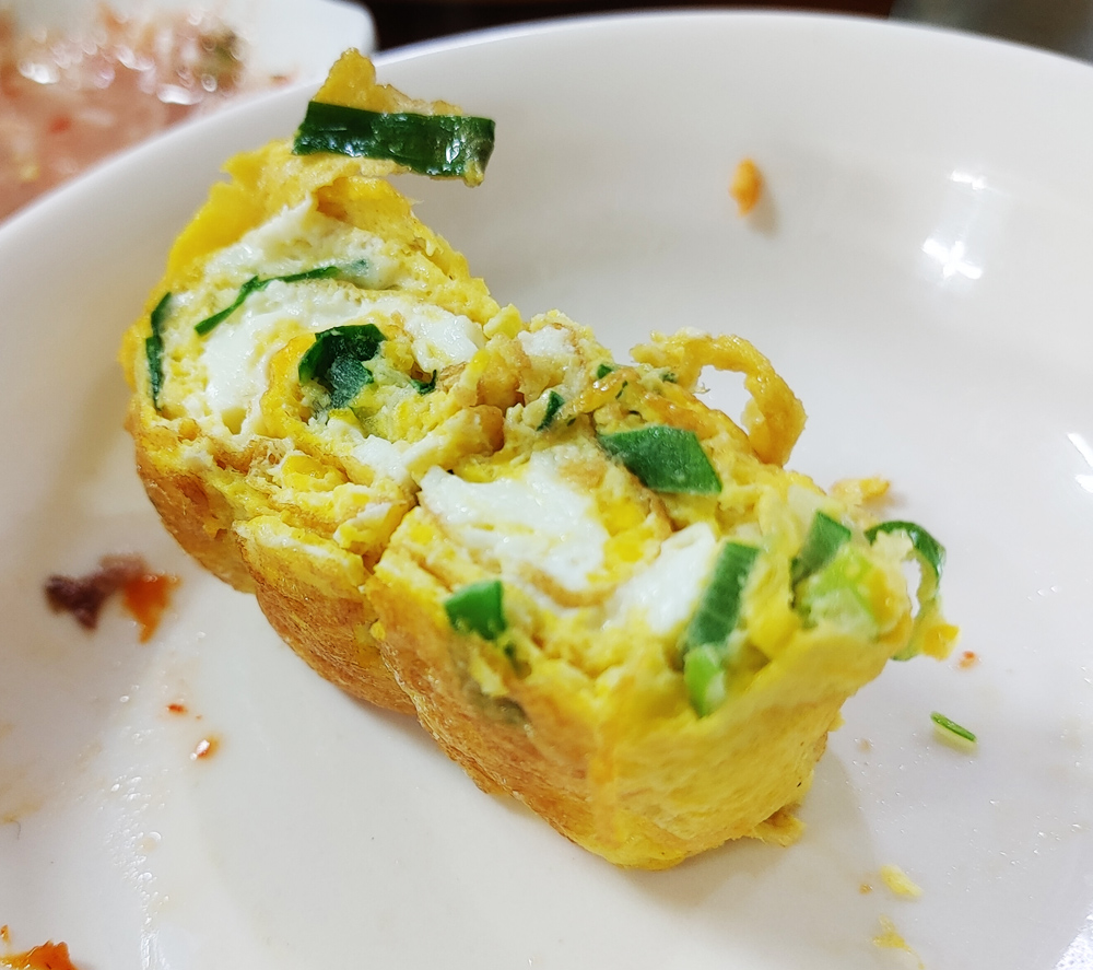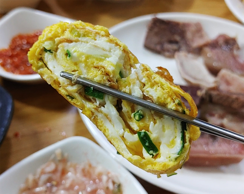오래 삶아낸 부드럽게 머릿고기와 집에서 어머니가 한 것같은 계란말이입니다.