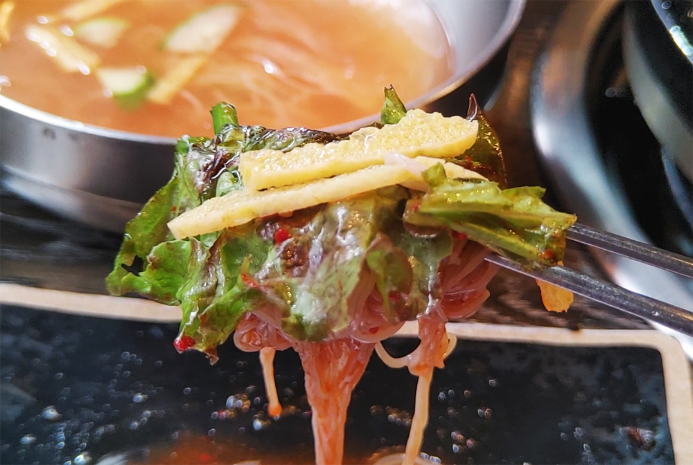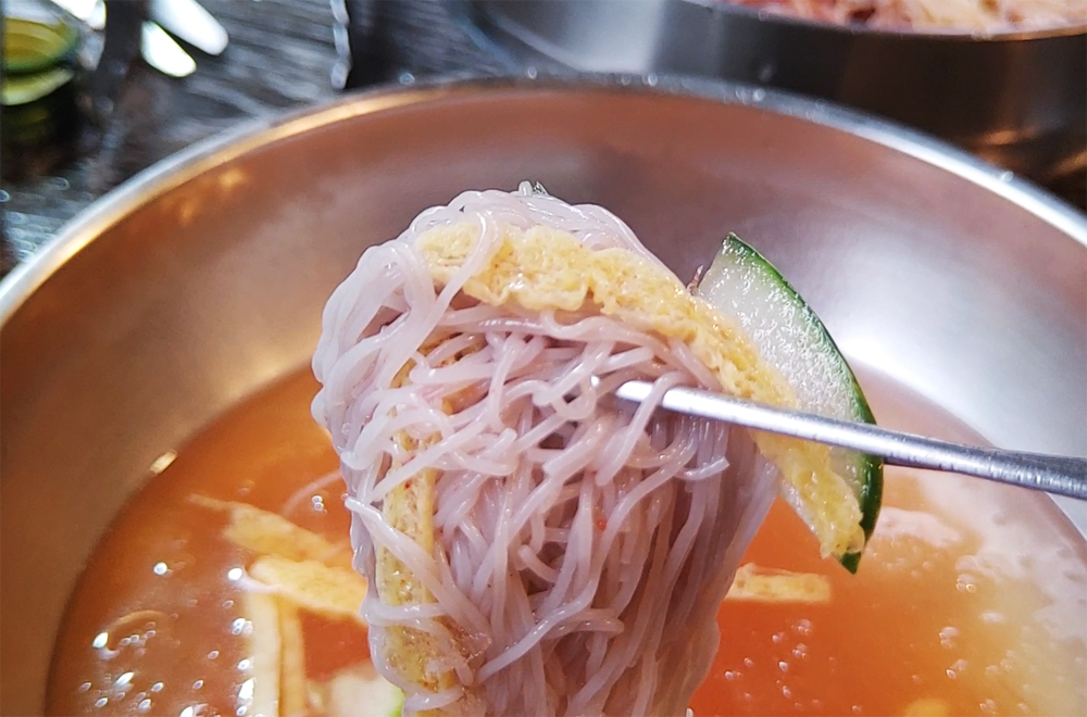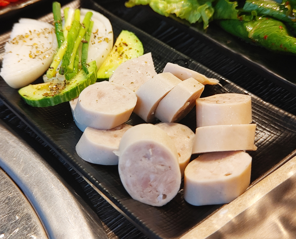 눈꽃살과 삼각살, 소세지, 채소, 비빔냉면, 물냉면으로 구성된 메뉴입니다.