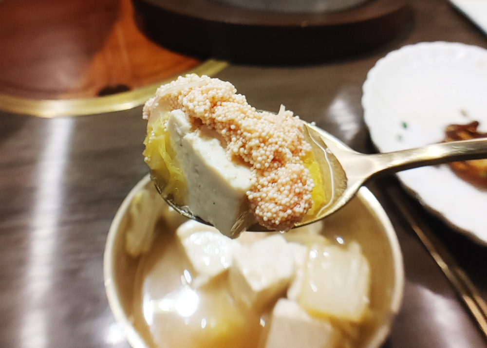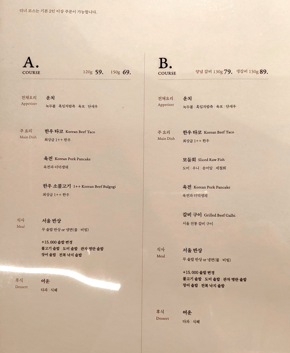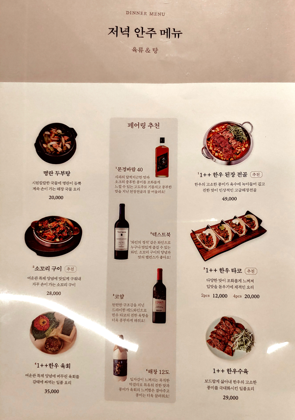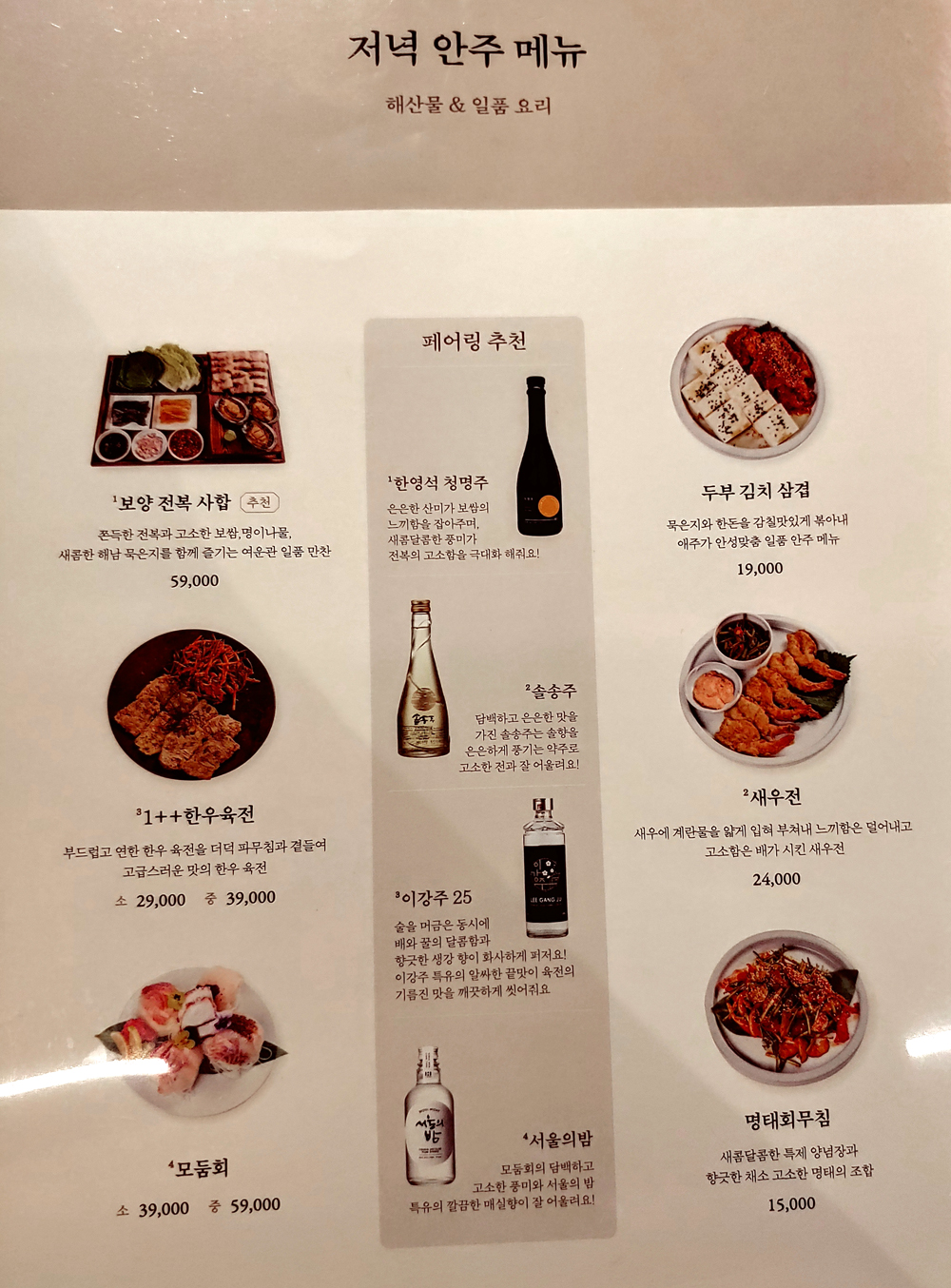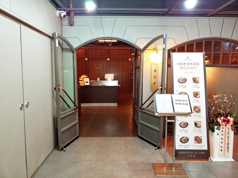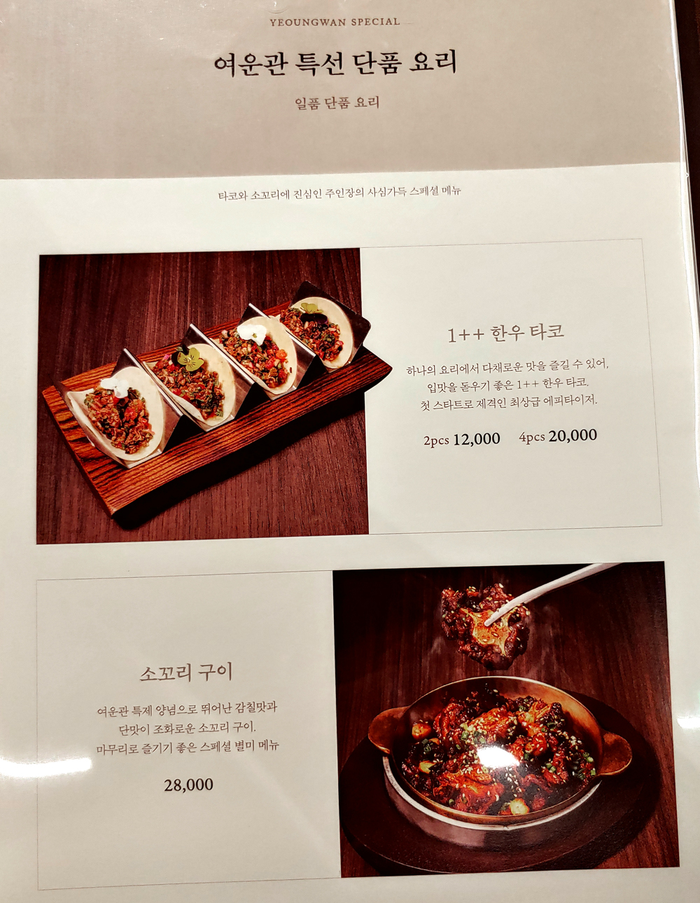 여의도 농협재단 빌딩 푸드 스퀘어에 자리한 서울요리 식당 여운관의 1++한우타코와 명란두부탕, 소꼬리구이입니다.