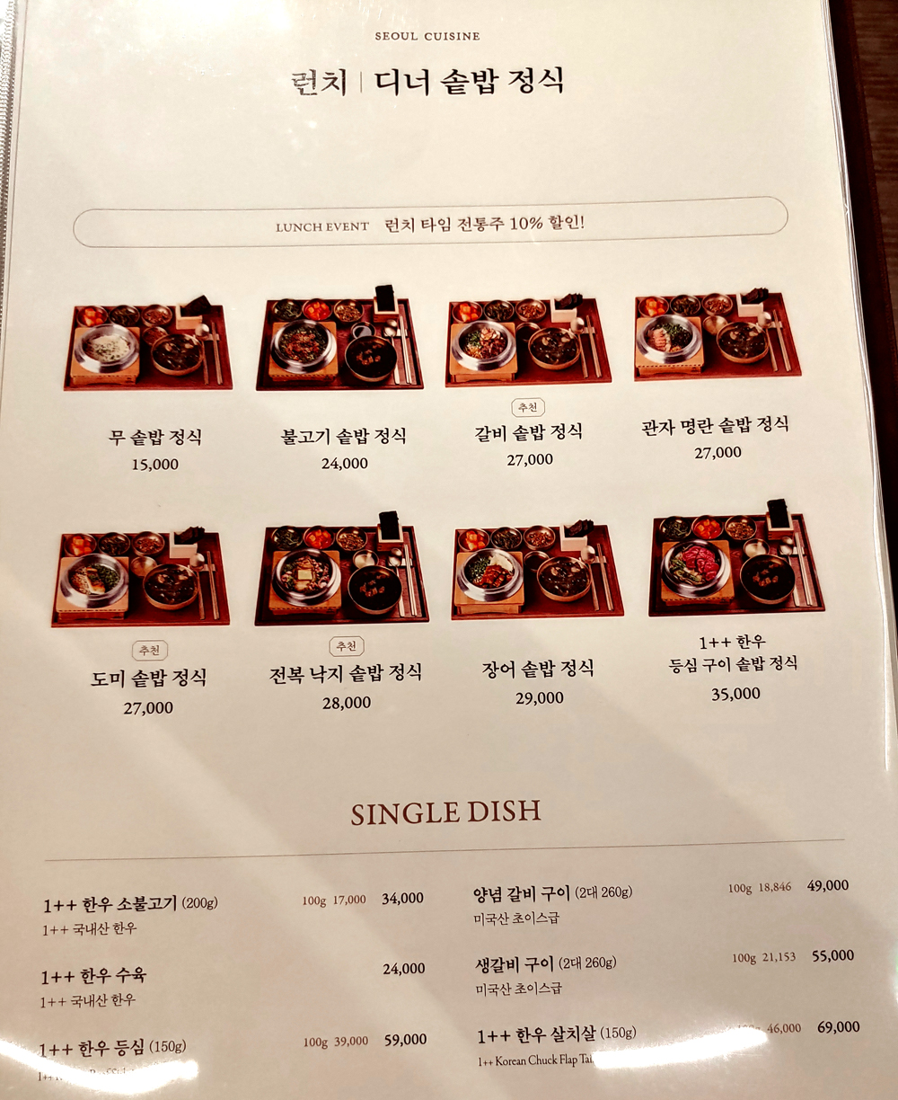 여의도 농협재단 빌딩 푸드 스퀘어에 자리한 서울요리 식당 여운관의 1++한우타코와 명란두부탕, 소꼬리구이입니다.