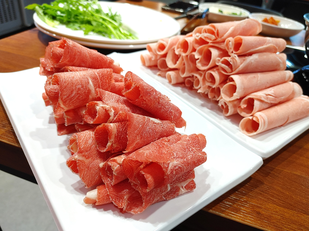 소고기와 양고기, 삼겹살, 우삽겹을 무한리필로 먹을 수 있습니다.