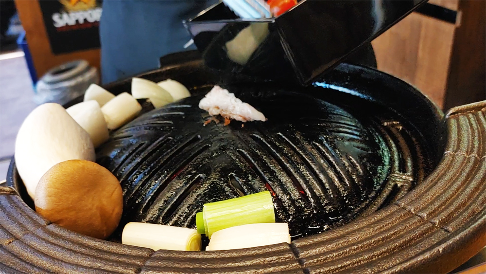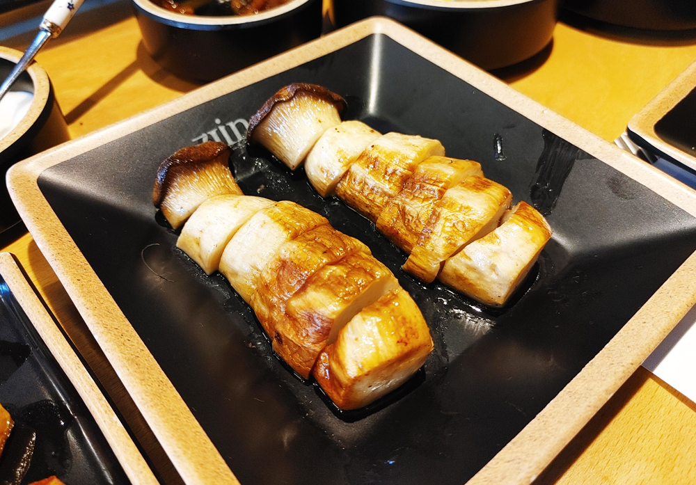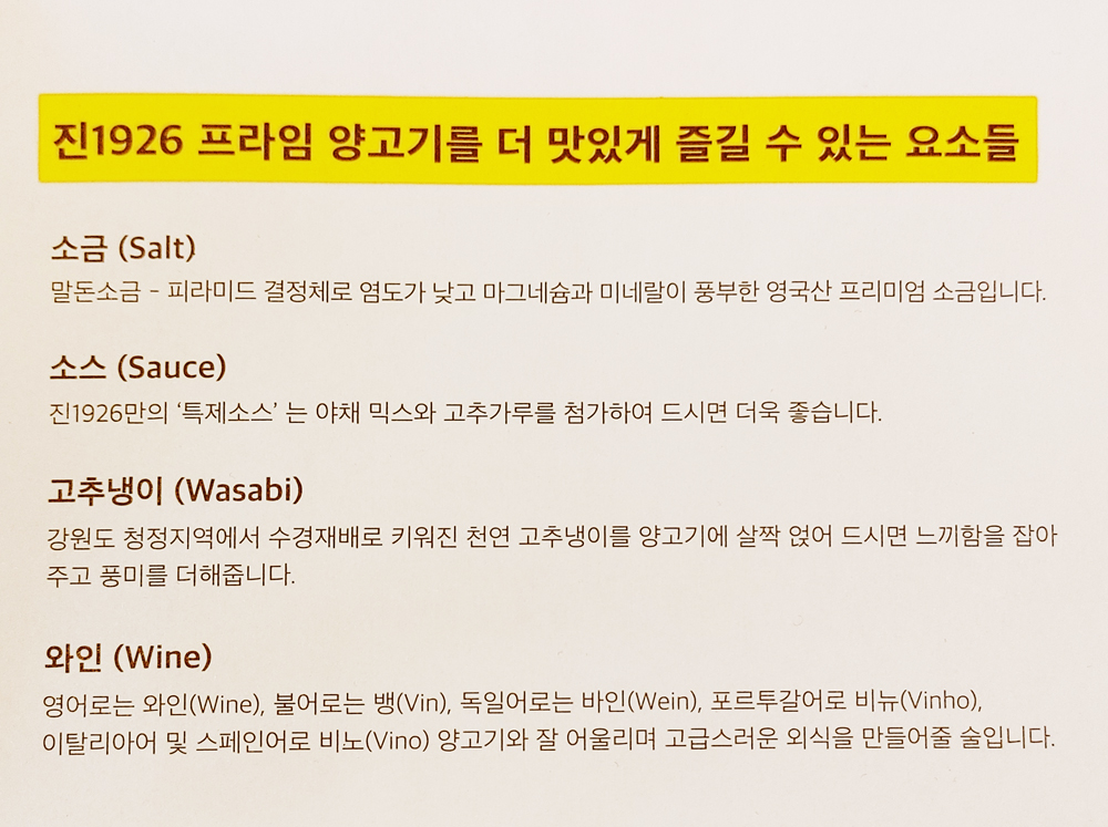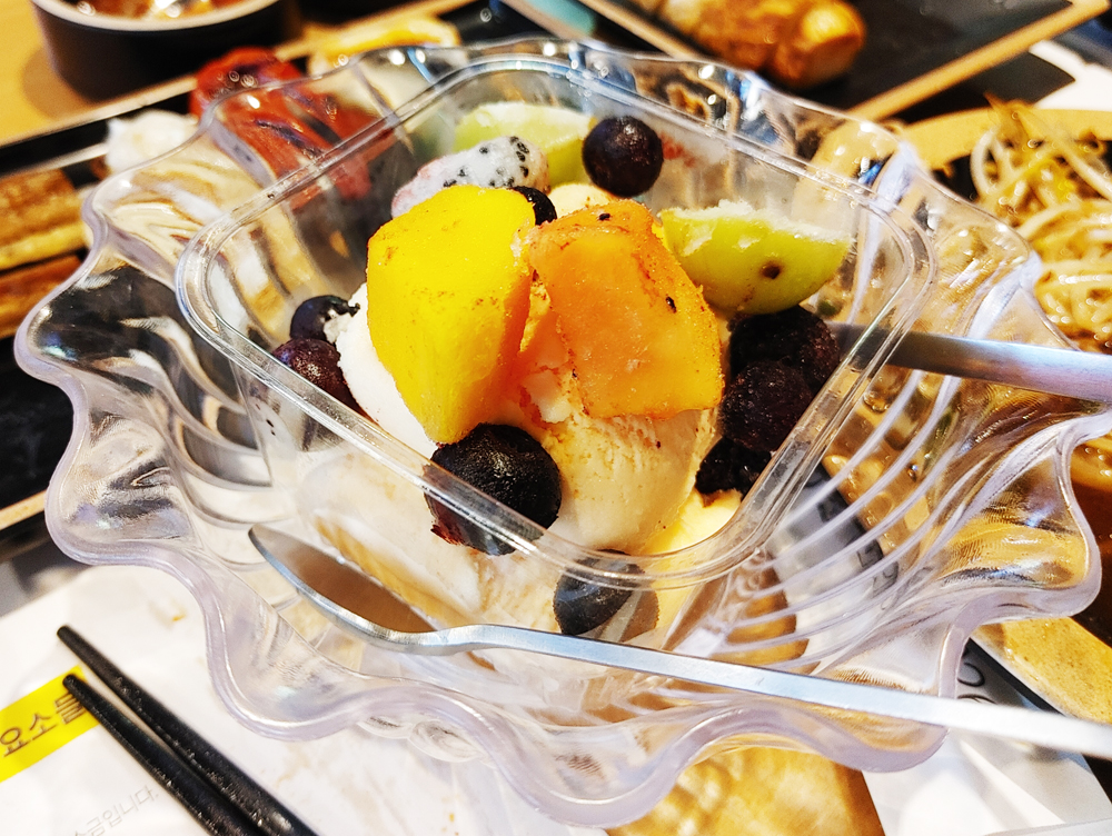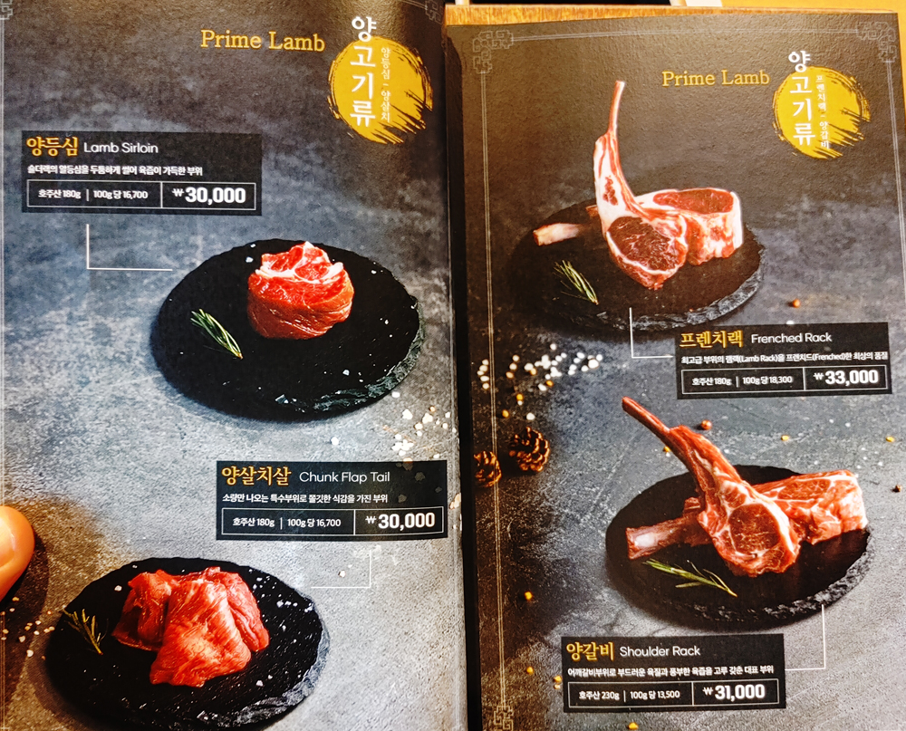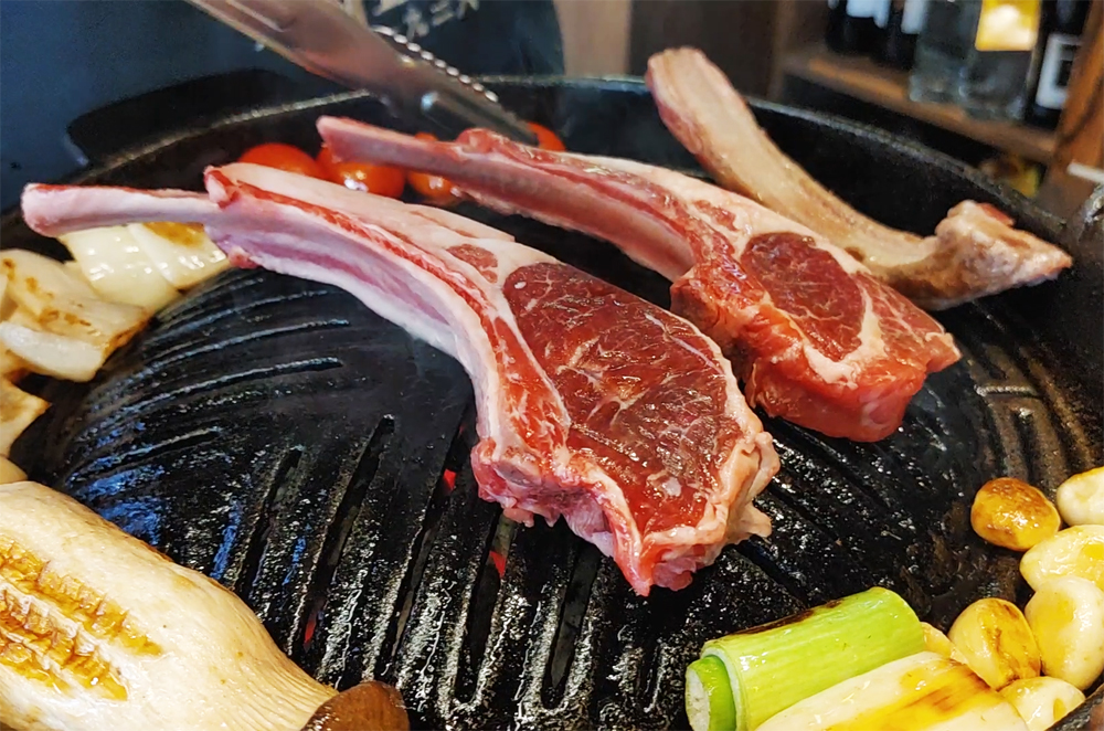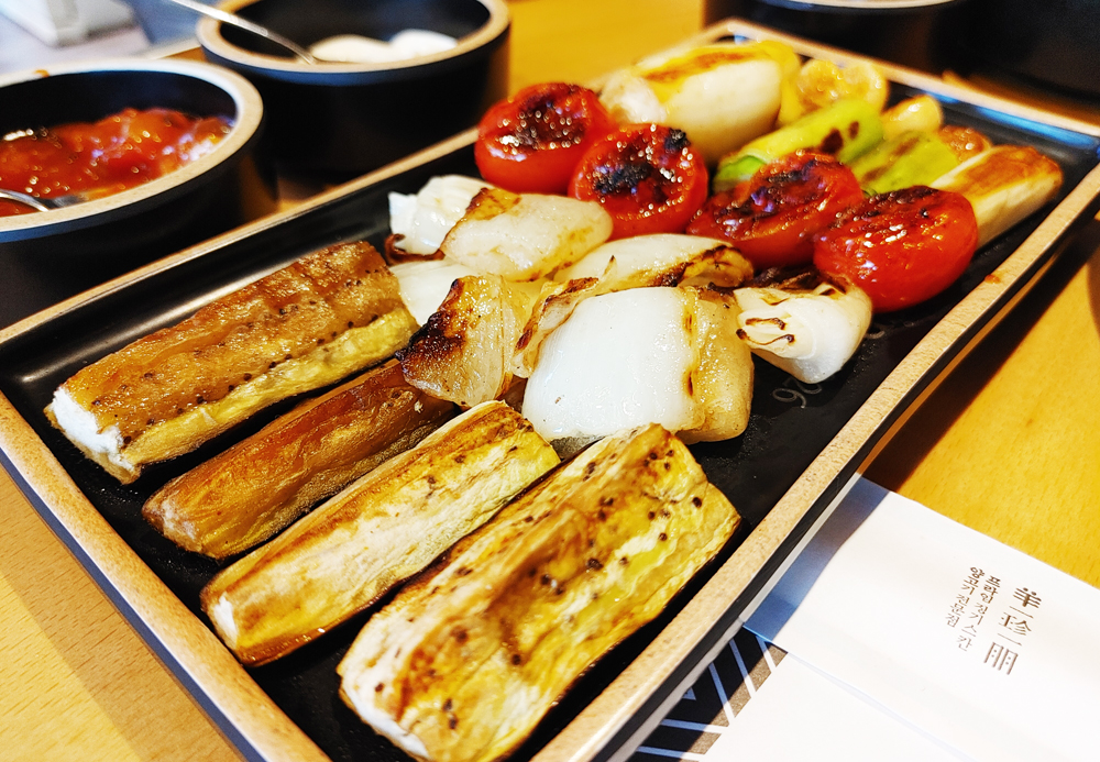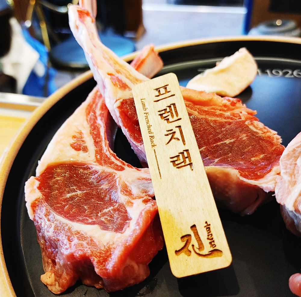 양갈비와 프렌치랙, 채소구이, 버섯구이, 숙주볶음, 후식으로 파인애플 샤베트까지 제공됩니다.