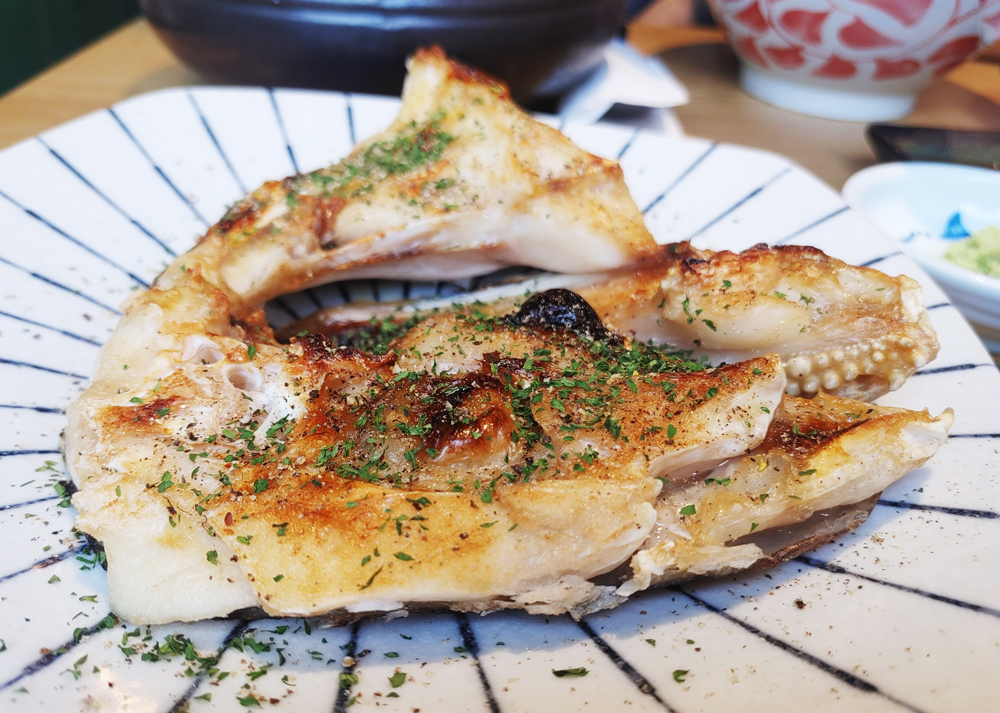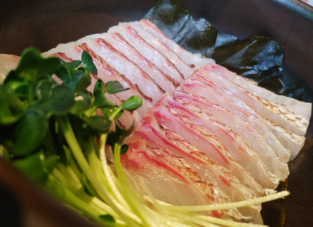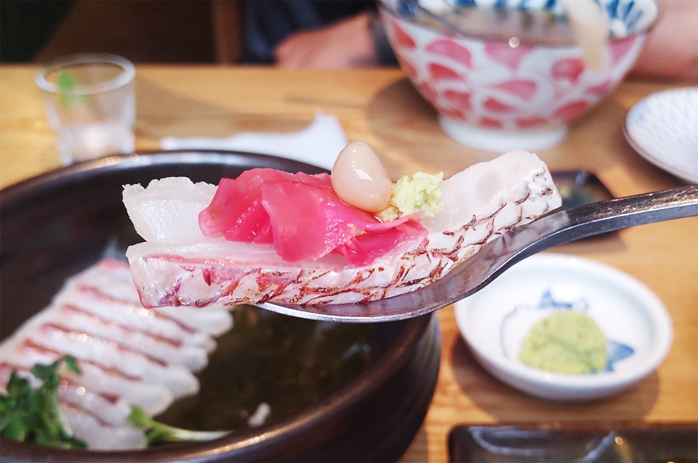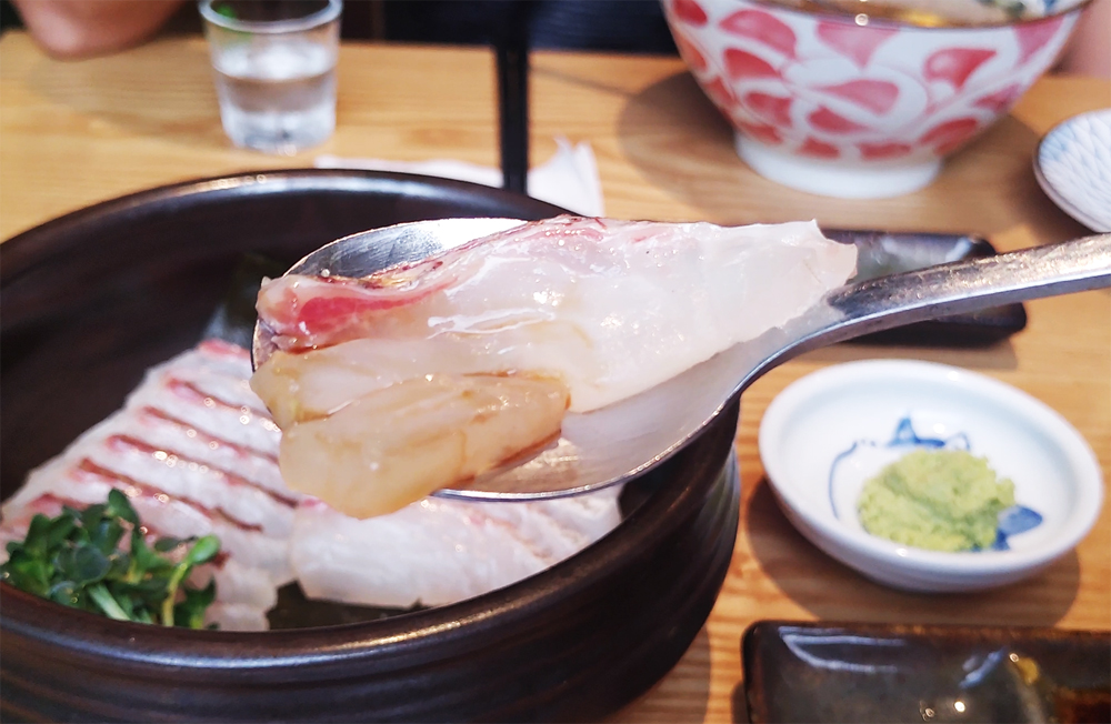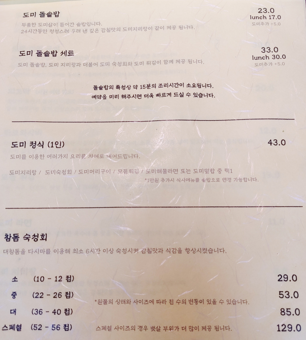 도미지리탕, 도미숙성회, 도미머리구이, 모듬튀김 순서로 나오며,
