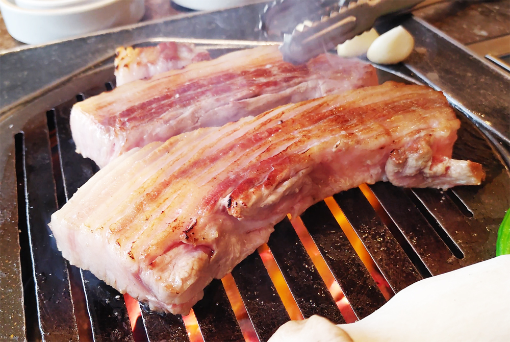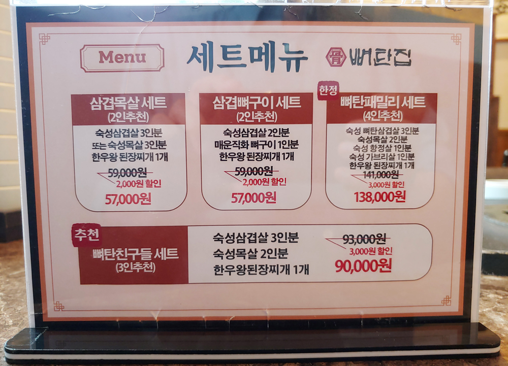 뼈탄집 용산직영점의 삼겹세트, 한우왕 된장찌개, 매운직화 뼈구이입니다.