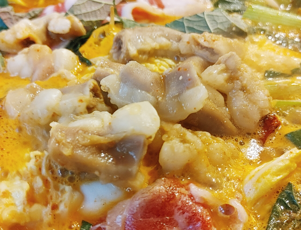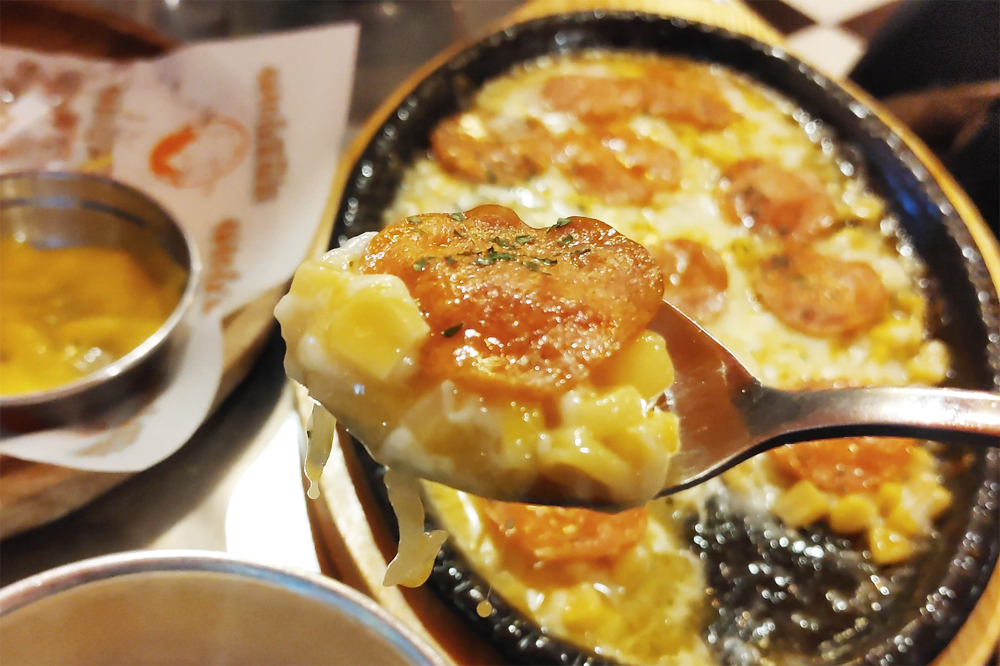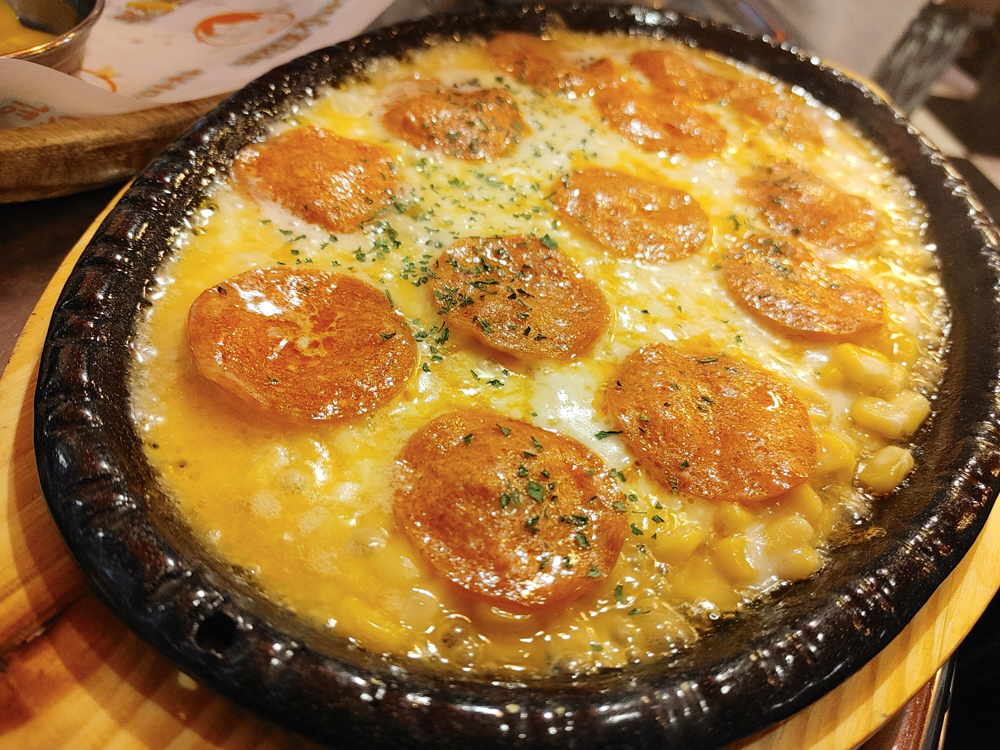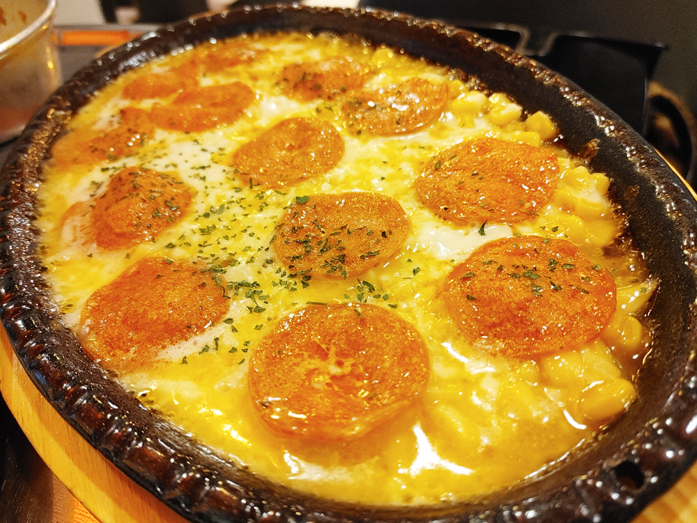 가성비 술집 역전포장마차 신촌점의 곱창전골과 사이드 메뉴인 통마늘 염통, 닭껍질 튀김, 페페로니 콘치즈입니다.