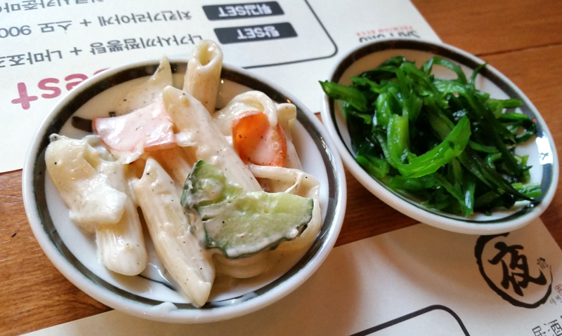 기본 찬으로 마카로니(?) 사라다와 미역초무침이 나왔습니다.
