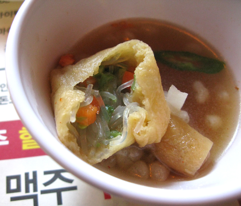유부주머니와 오뎅, 튀김가루 등이 몸을 담그고 있습니다.