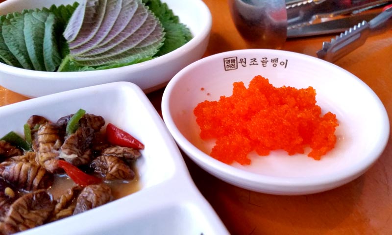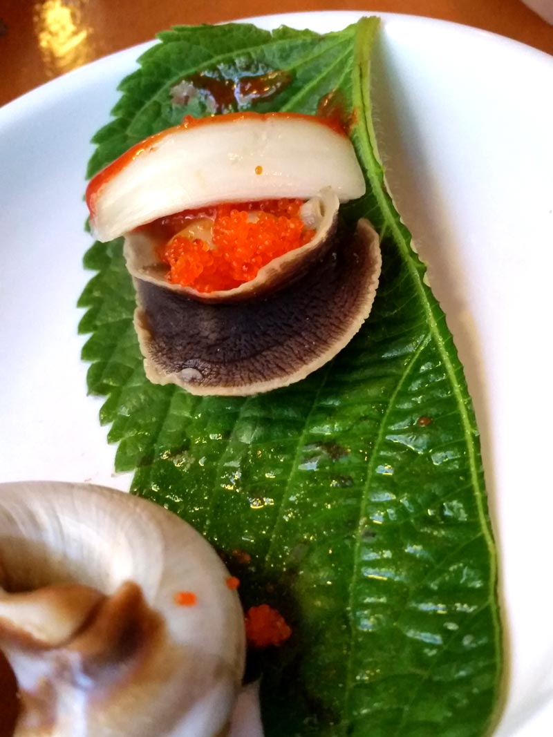 깻잎에 골뱅이 하나 까서, 날치알 올려주고