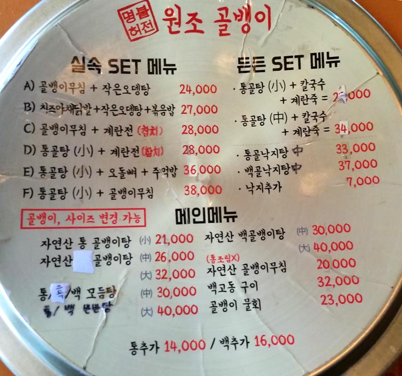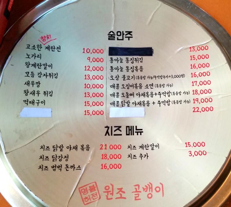 명불허전 원조골뱅이 영등포구청점의 메뉴판은 냄비뚜껑으로 아주 개성있는 연출을 하였습니다.