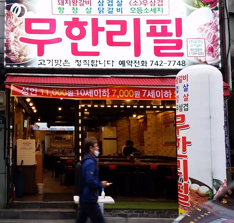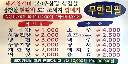 간판에서 보시디시피 돼지왕갈비, 삼겹살, 우삼겹, 항정살, 닭갈비, 소세지가 주메뉴인 무한리필 고깃집입니다.