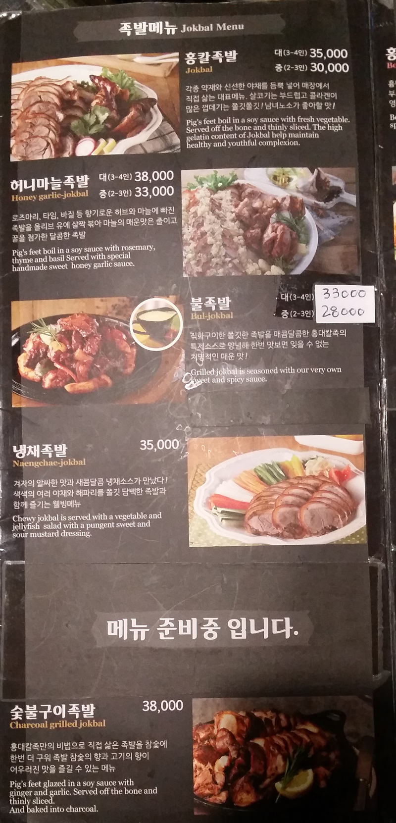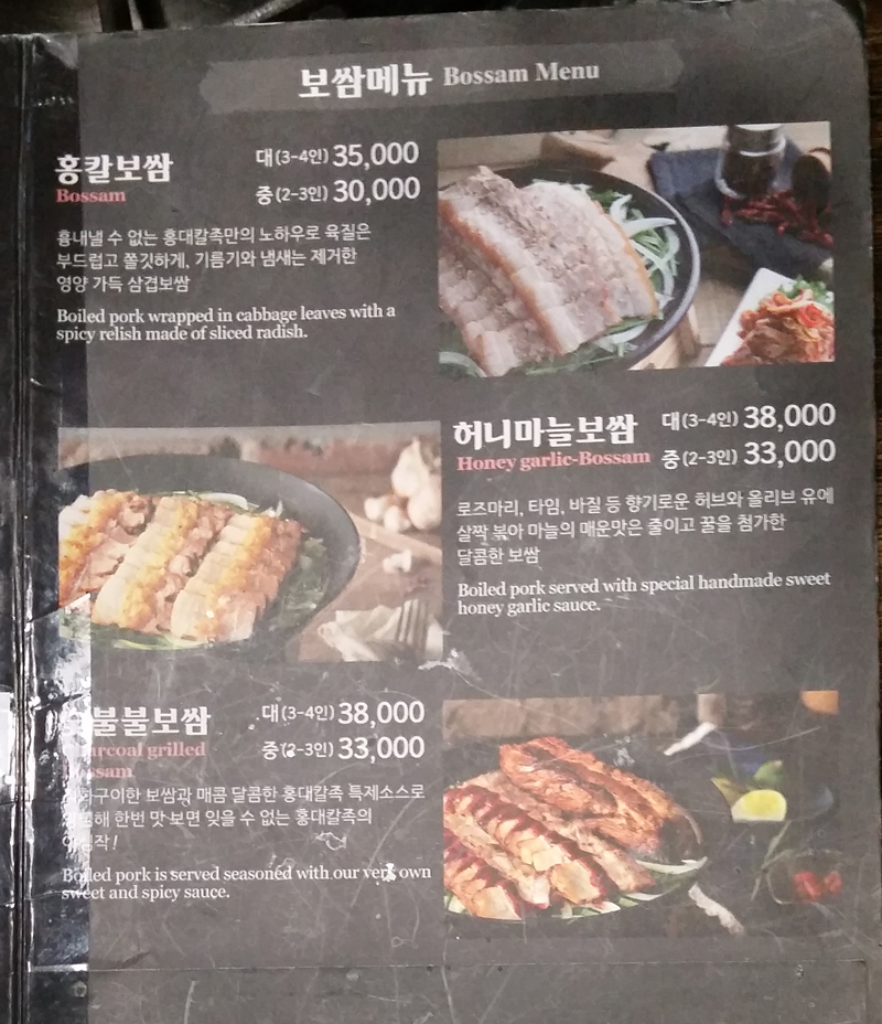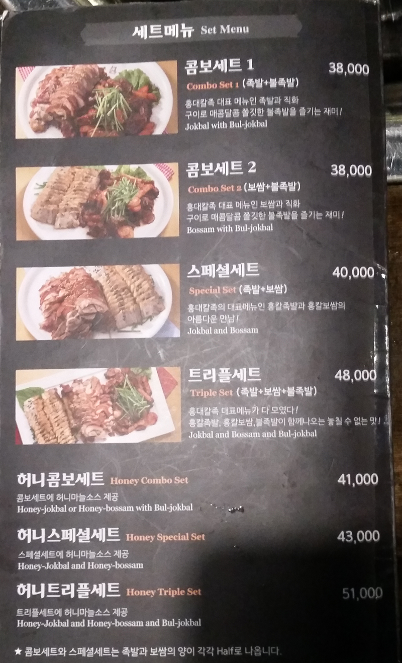 매뉴는 족발류와 보쌈류 그리고 이것들을 절묘하게 하이브리드 콤비네이션 퓨전 짬뽕시킨 스페셜 세트 메뉴들이 있습니다.