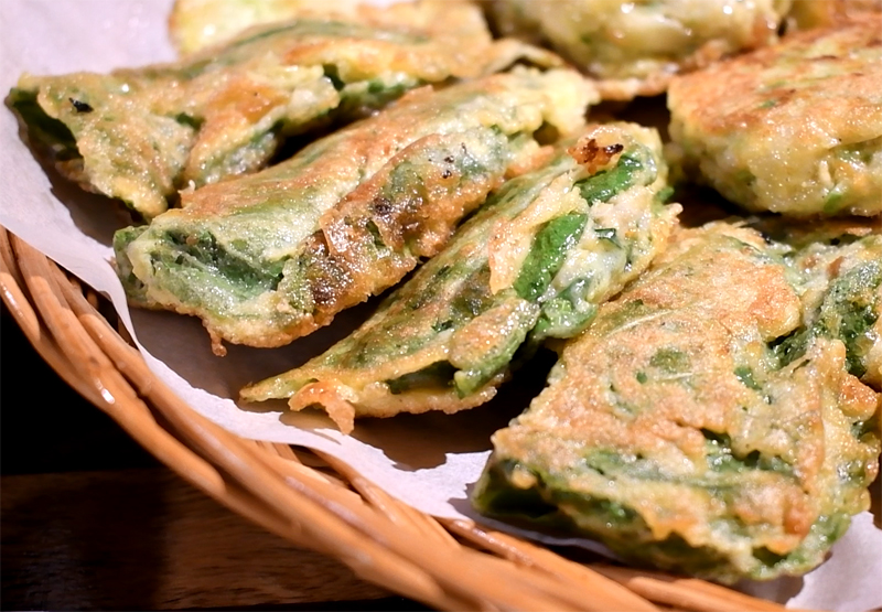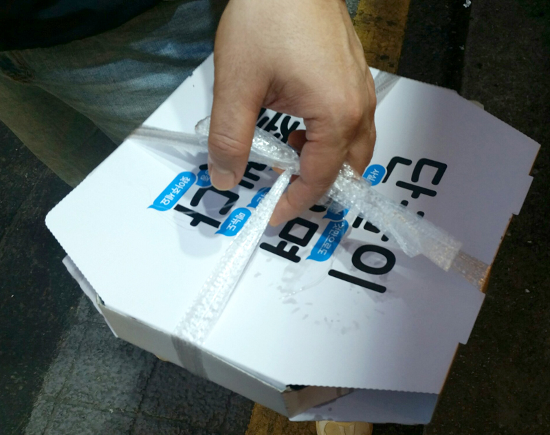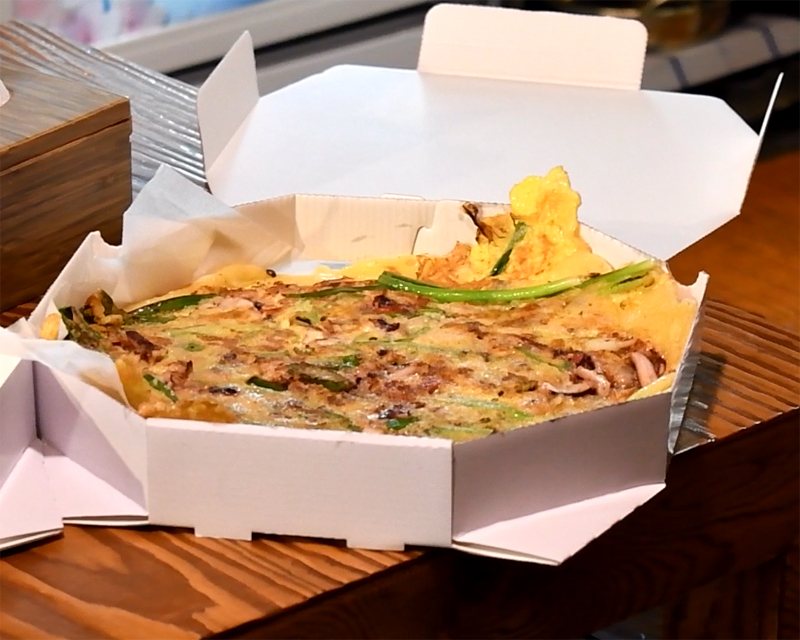 친구는 집에 있는 아내를 위하여 해물파전을 포장해가네요.
