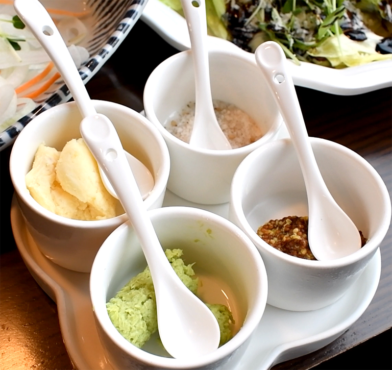 짭잘한 치즈와 깨소금, 씨겨자, 고추냉이가 있습니다.