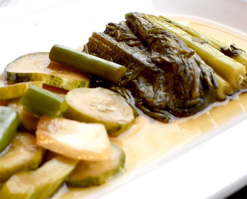 오이, 마늘쫑, 갓 등이 있는 절임 장아치.