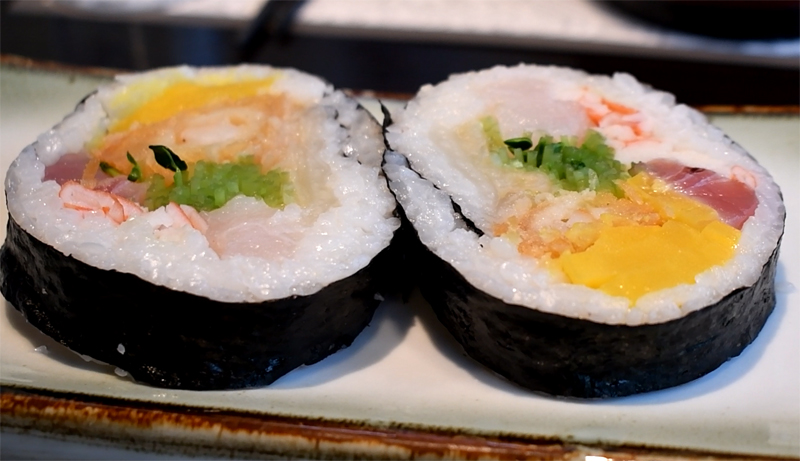 후토마키인데요, 참치와 단무지, 새우튀김 등 김밥처럼 여러 가지 속재료를 채운 스시의 일종입니다.