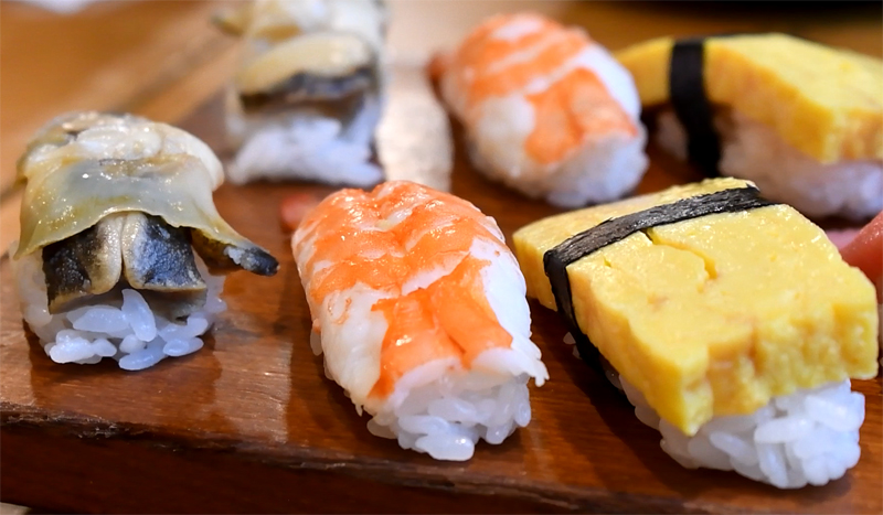 우측에서부터 광어, 연어, 참치뱃살, 계란, 새우, 소라 초밥이 되겠습니다.