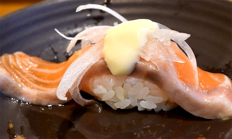 연어초밥은 부드러운 연어살에 아삭한 생양파에 달콤한 소스가 어우러져
