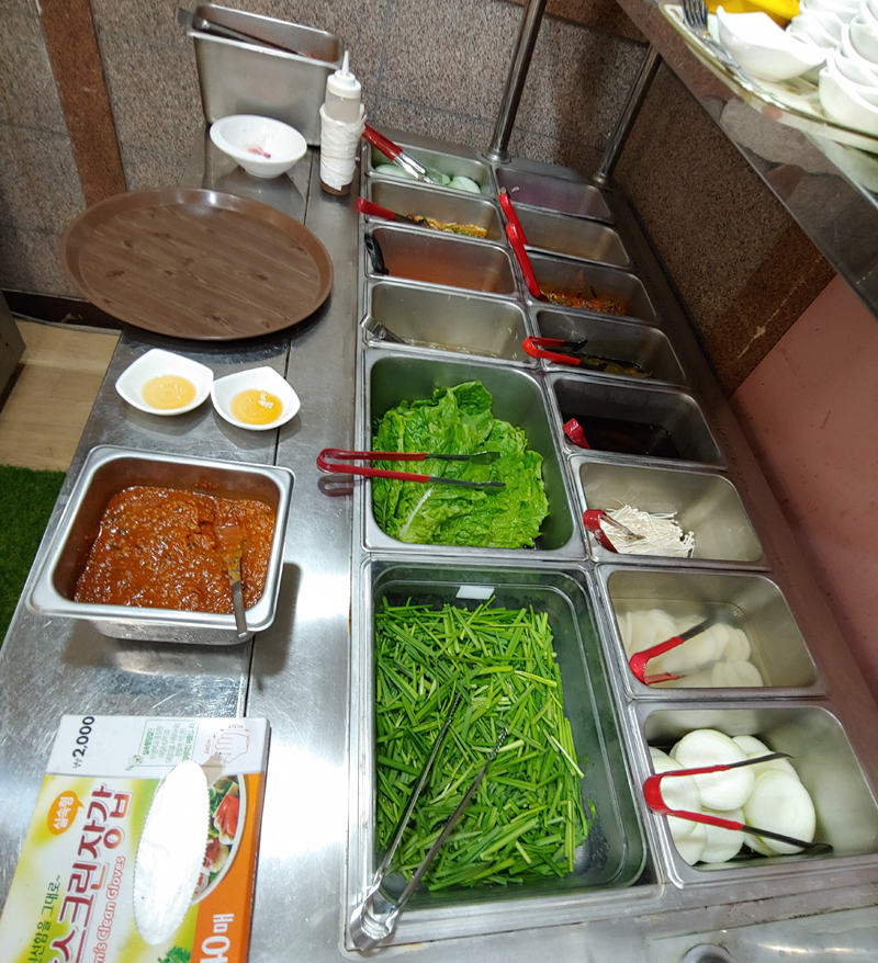 그리고 각종 채소와 소스 밑반찬이 있으니 취향껏 알아서 가져다 먹으면 되시겠습니다.