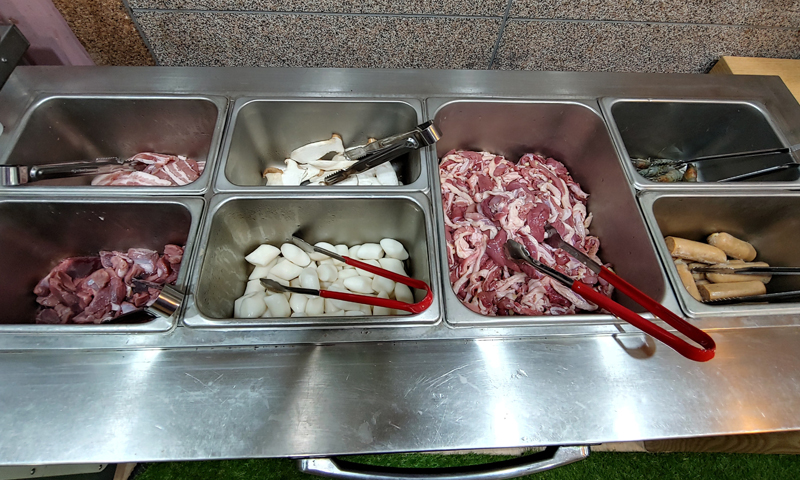 대표인 생오리 고기와 새우 소세지, 삼겹살, 근위(닭똥집), 버섯과 가래떡이 준비되어 있습니다.