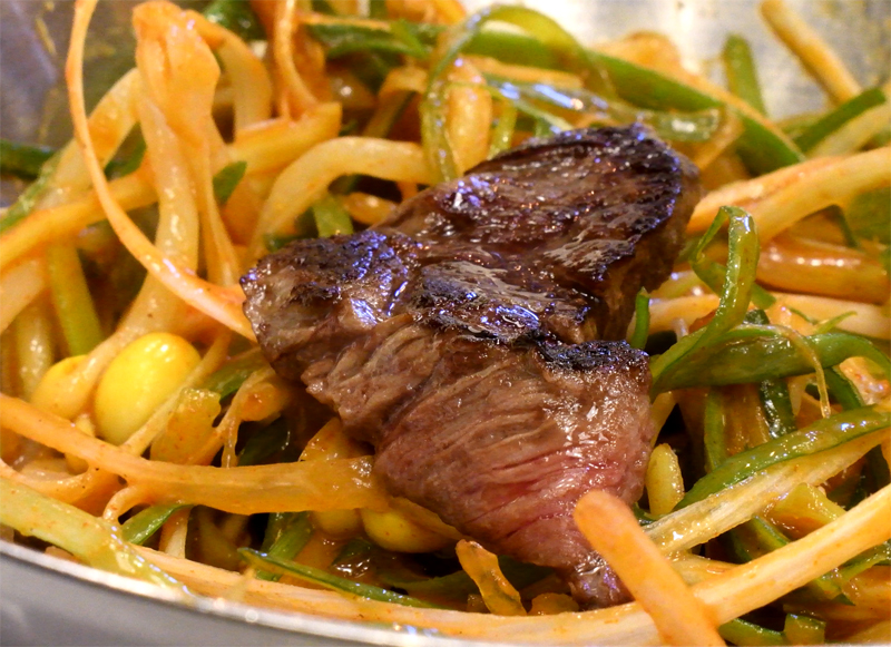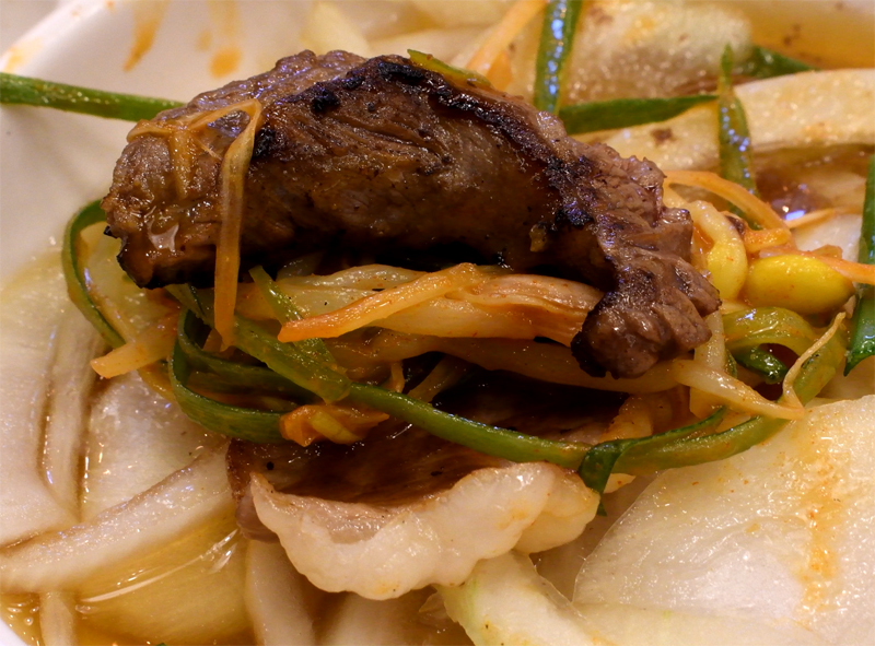 ...에다가 콩나물 파채 무침에 갈빗살을 얹어서는 한입에!