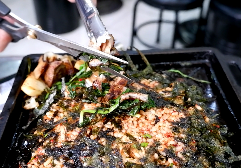 우리는 먹던 내장을 조금 남겨 밥 위에 조져 얹어버리는 방법을 취해봅니다.