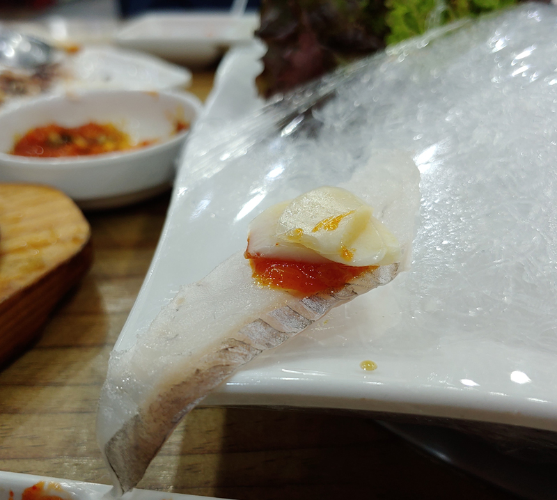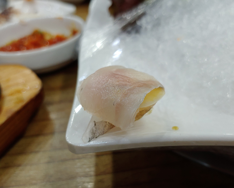 탄력있는 우럭의 살을 뚫고 서걱하는 강렬한 마늘의 맛과 새콤달콤짭잘한 초장이 회의 밋밋함을 채워줍니다.