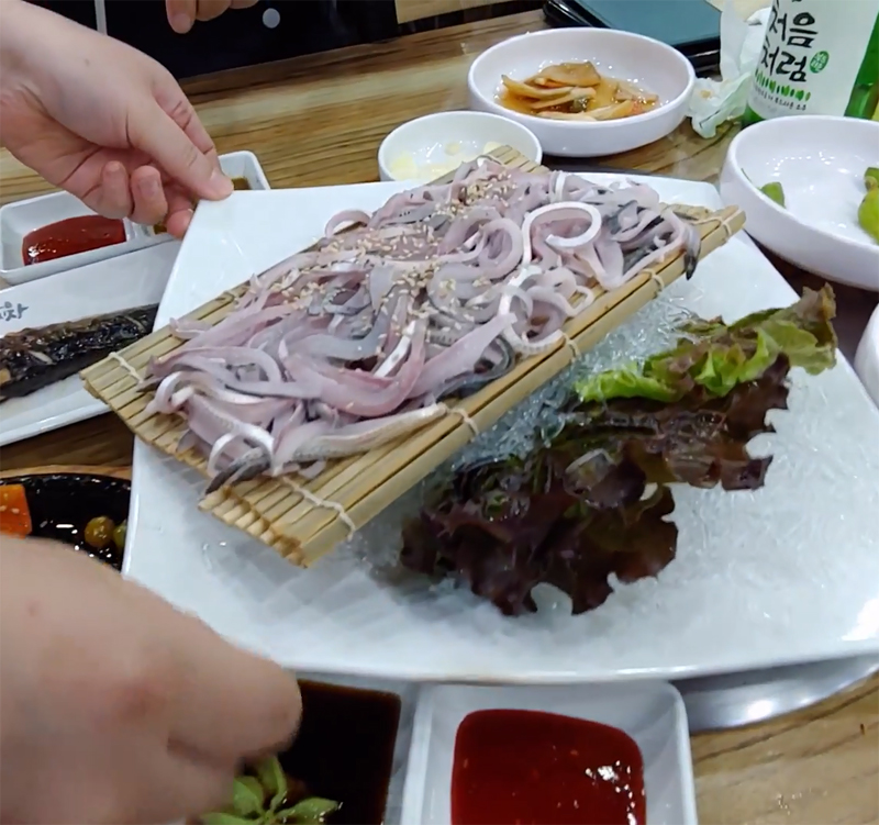 후배는 전어가 나오자 한쌈 만들어버립니다.