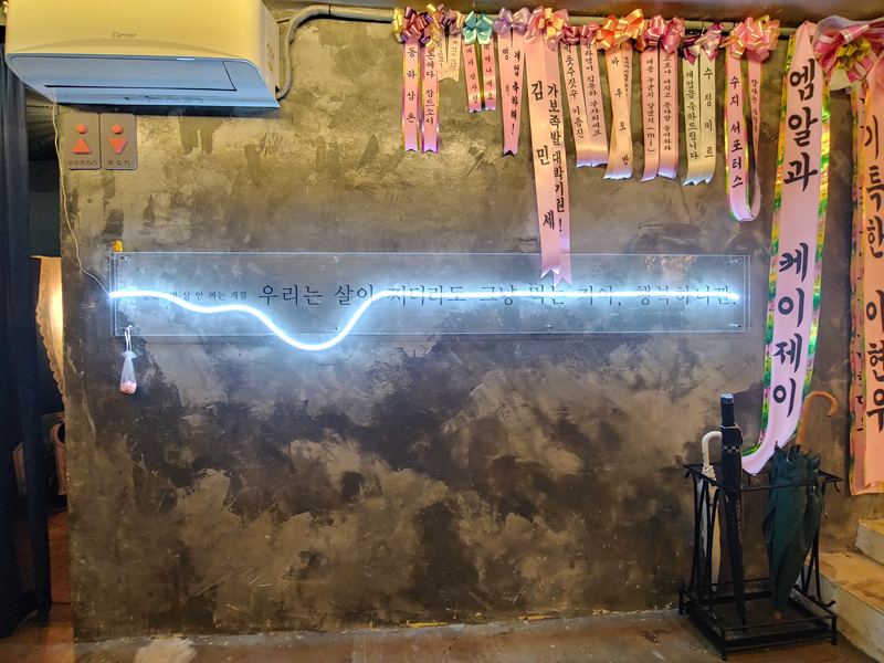 아까도 말씀드렸다시피 신생 가게라 개업 축하 화환의 리본들이 즐비하게 널려 있구요.