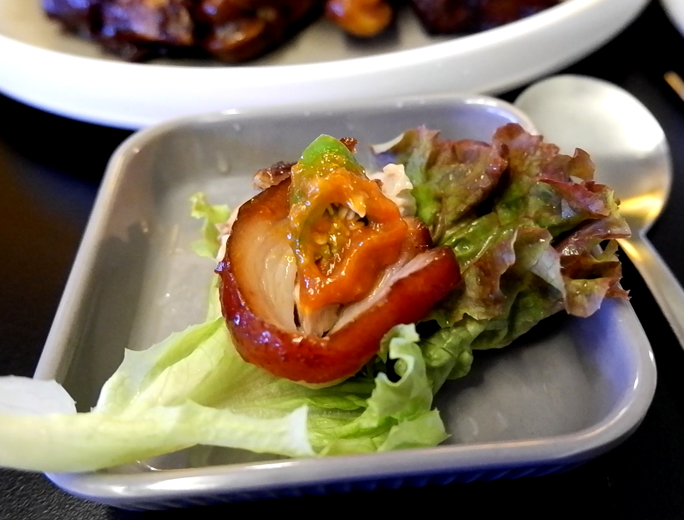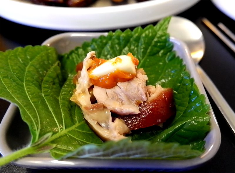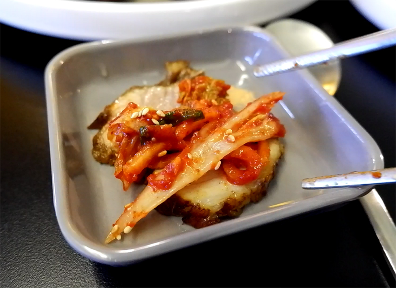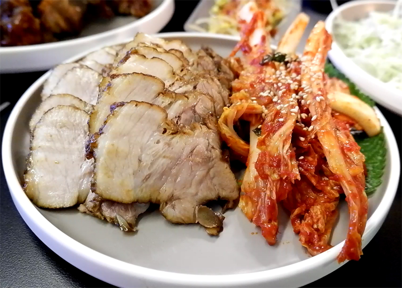 다음은 보쌈고기 한 점에 간간한 배추 겉절이 김치 하나 올려 한입!