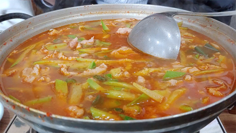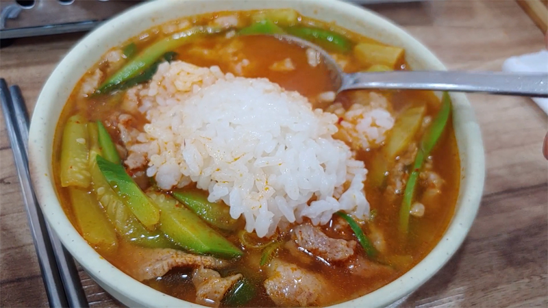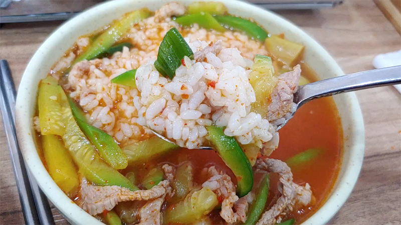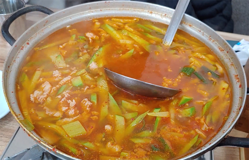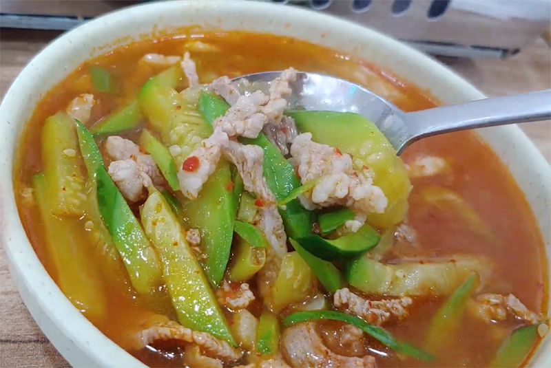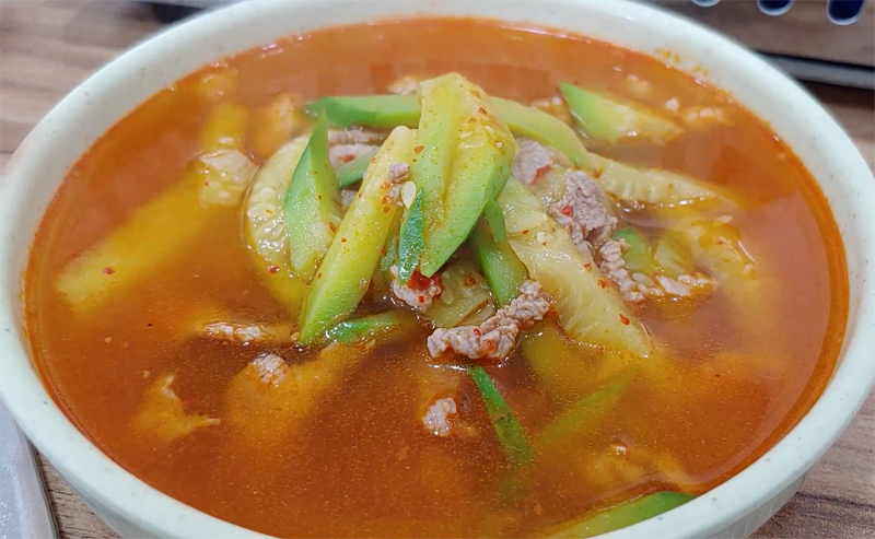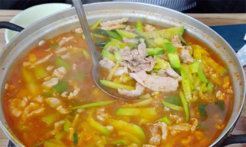 마치 음식 처음 하는 사람이 냉장고에서 나온 애호박과 돼지고기를 가지고 그냥 국을 끓인 듯합니다.
