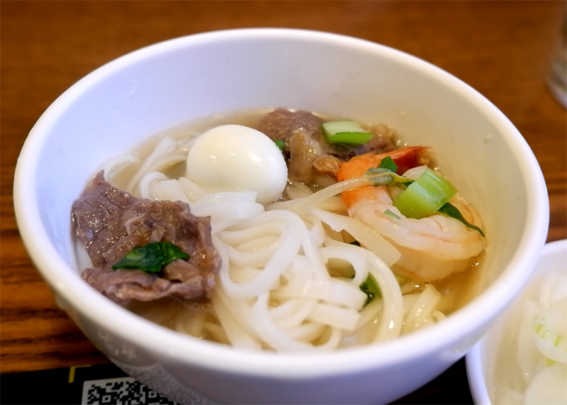 쌀국수와 쇠고기, 새우, 어묵, 당근, 부추, 쪽파, 숙주, 청경채 등이 들어가 있습니다.