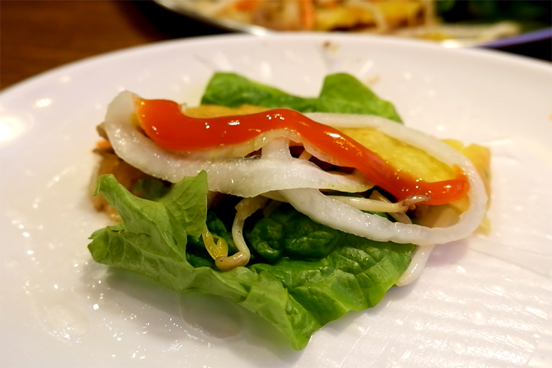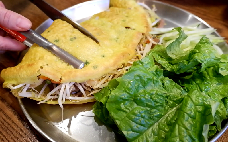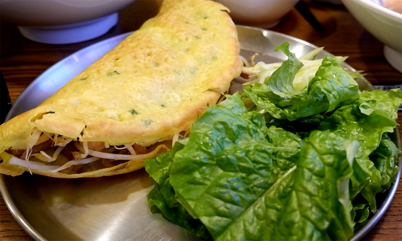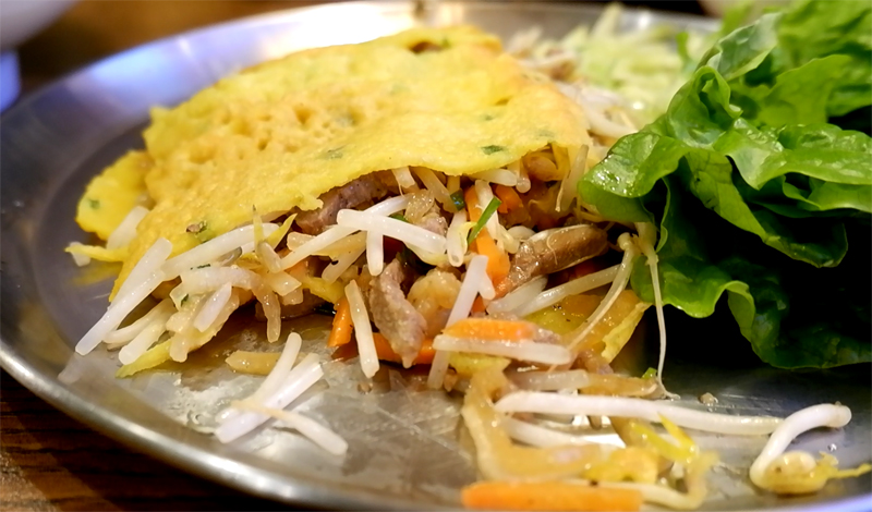 반세오는 숙주, 돼지고기, 새우, 당근, 무를 얹어 반달 모양으로 전을 부쳐서