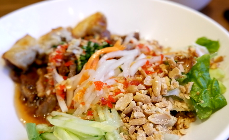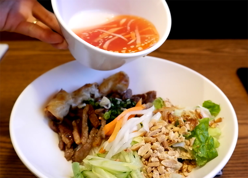 분짜는 소면 같은 쌀국수에 돼지고기와 야채, 땅콩 등을 얹어 소스를 부어 비벼 먹는 비빔쌀국수입니다.