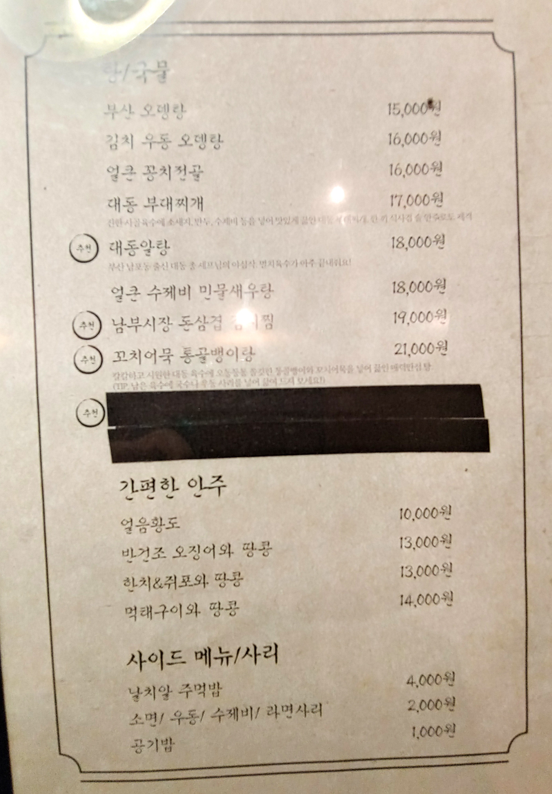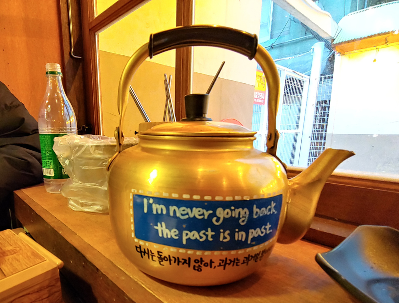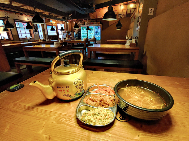 칼칼한 콩나물국에 단무지무침, (추억의) 소라과자, 마카로니 샐러드에... 시키지도 않은 막걸리...