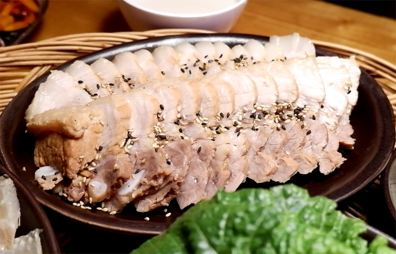 부드럽게 잘 삶아져 가지런히 썰어져 있는 돼지수육.