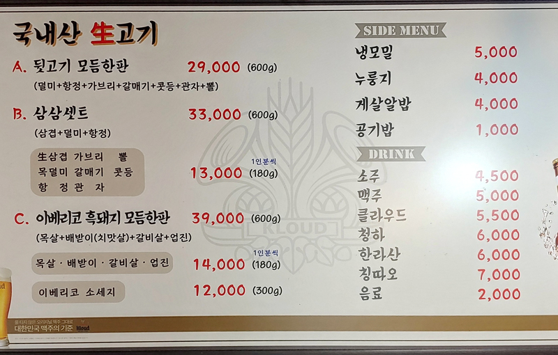 메뉴는 아래와 같이 오로지 고기만 돼지고기만을 판매합니다.