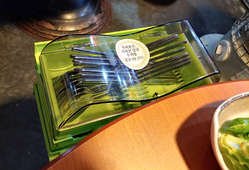 '특허받은 자외선 살균 수저통'이라고 적혀있네요.