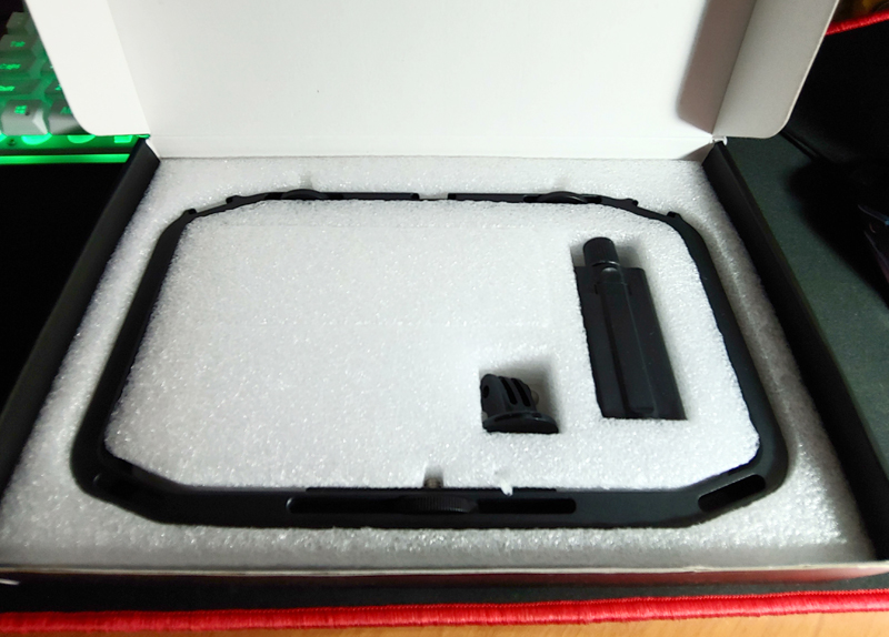 박스를 열면 알루미늄 케이지와 스마트폰 홀더와 액셤캠 홀더 있습니다.