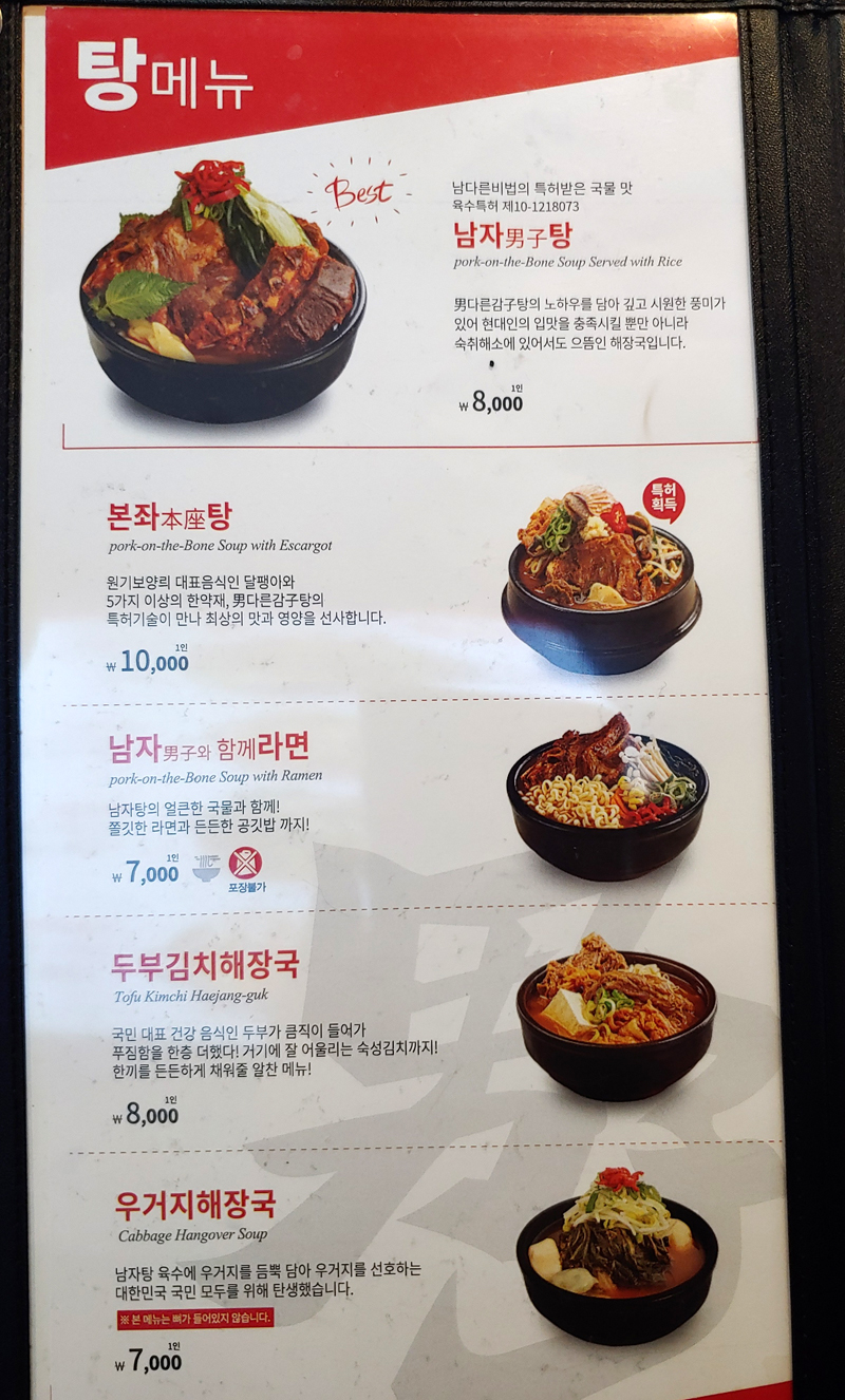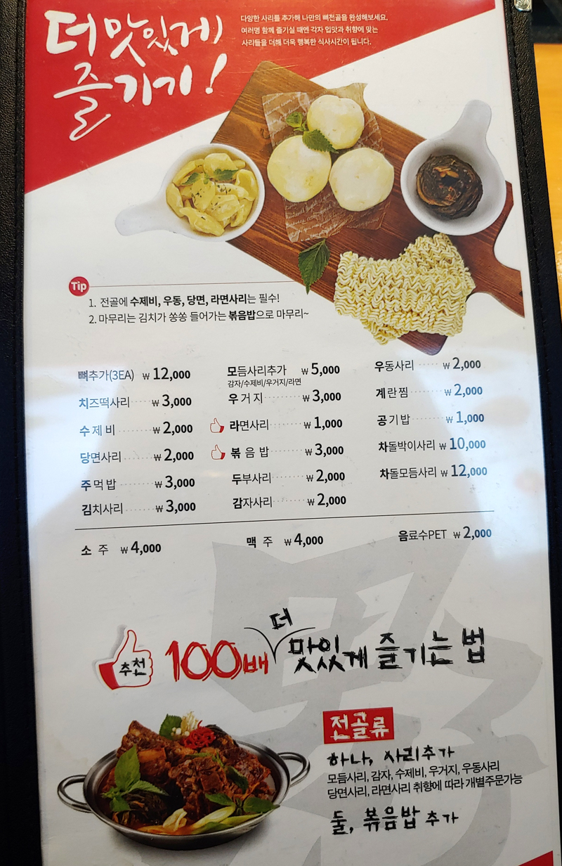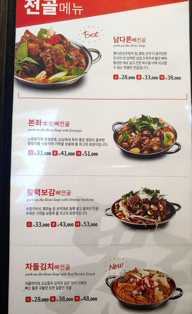 메뉴는 크게 네 종류로 개인 식사용인 탕메뉴, 모임용으로 찜메뉴와 전골메뉴,