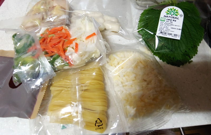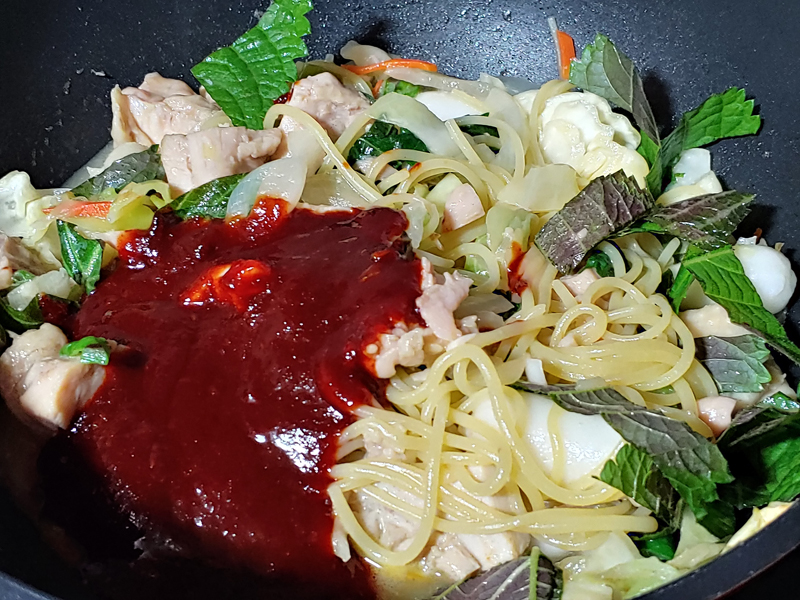내용물은 채소, 익은 닭고기, 치즈떡, 쫄면, 치즈, 양념장이 들어 있습니다.