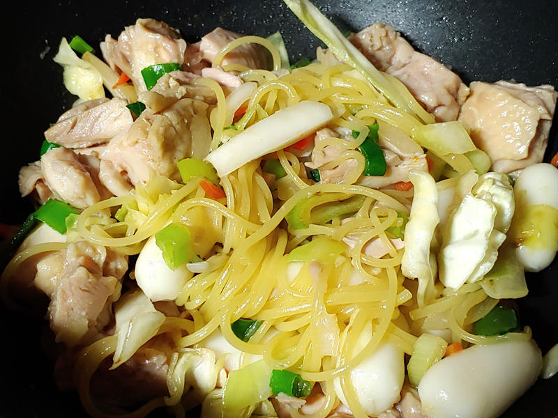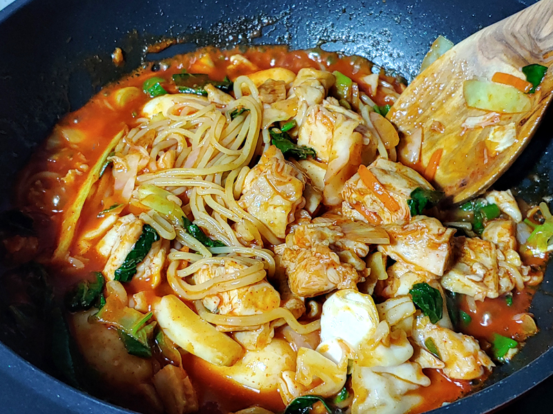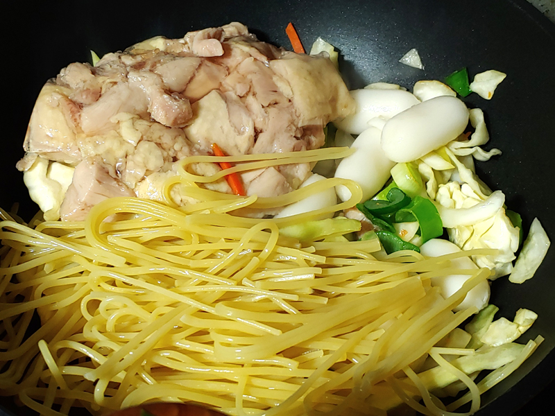 치즈떡과 익은 닭고기, 쫄면을 넣고 2분간 달달달 볶아주기