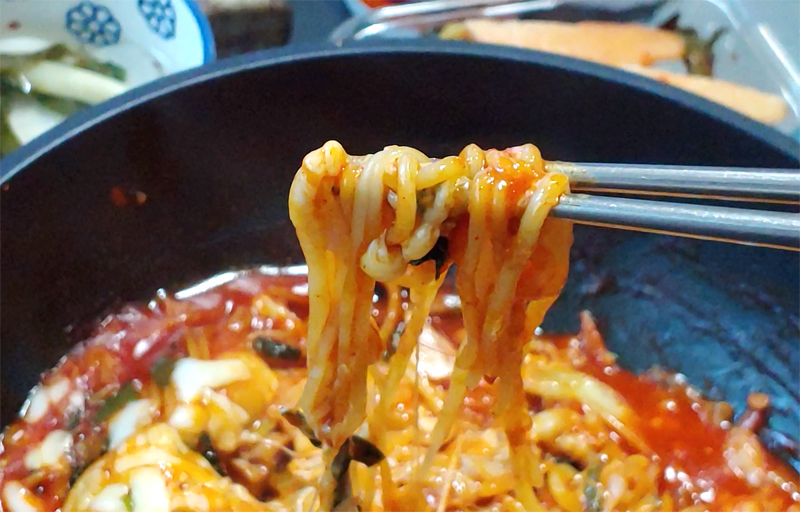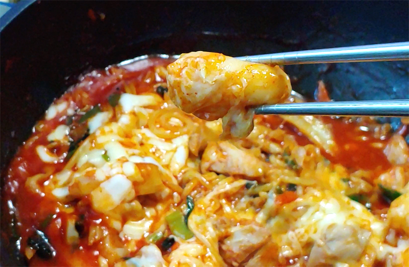 대충 쫄면이 풀어지고 떡도 익고 닭고기의 기름이 녹고 분리가 되면...