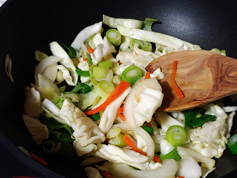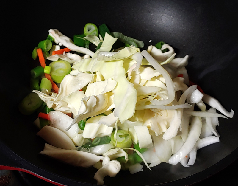 기름을 살짝 두른 1분간 달군 팬에 채소류 먼저 투하!