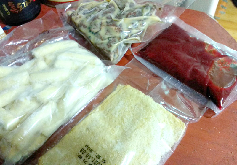기름이 잔뜩 굳어있는 연탄불고기, 소스, 얼은 밀떡, 납작 어묵... 단촐하다.